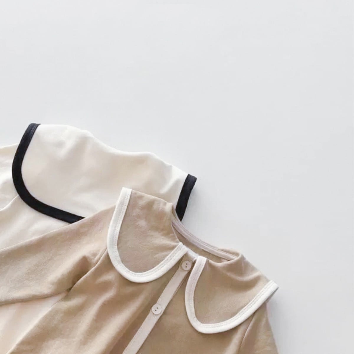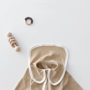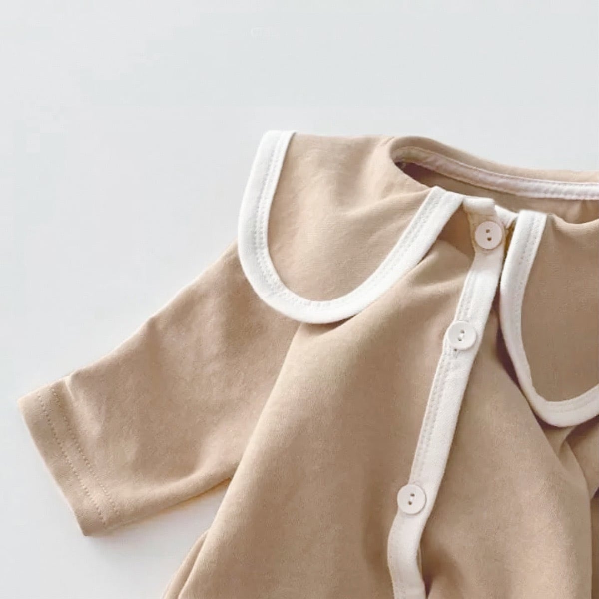 やさしい色合いのアイボリーとベージュの2色展開で、ナチュラルな可愛さが引き立つベビー用ロンパースです。