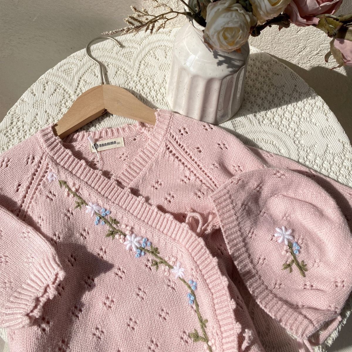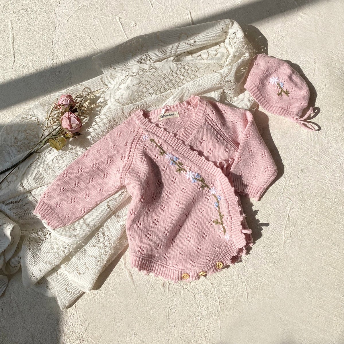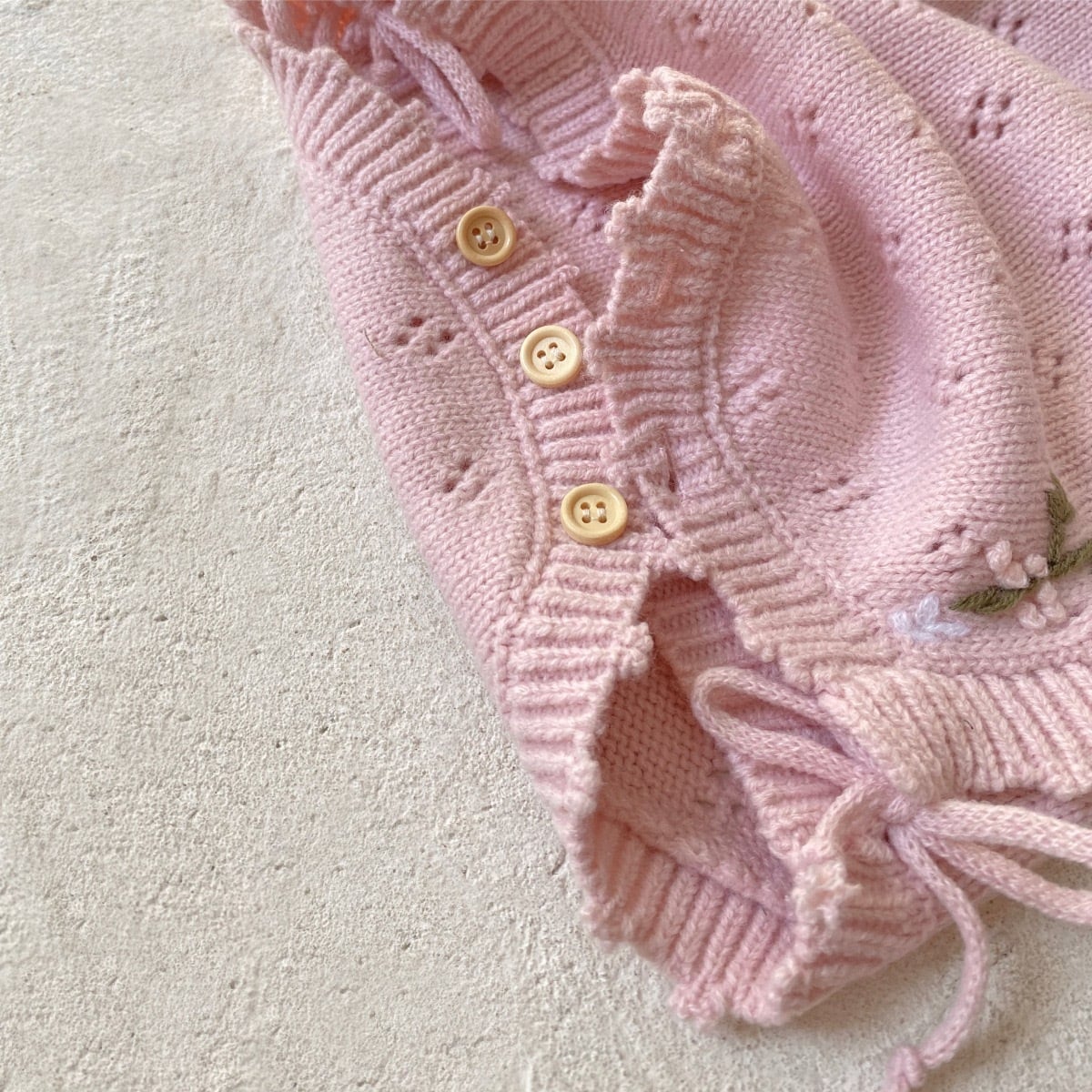 ,花刺繍が映えるピンクニット肌着ロンパース ボンネット付き