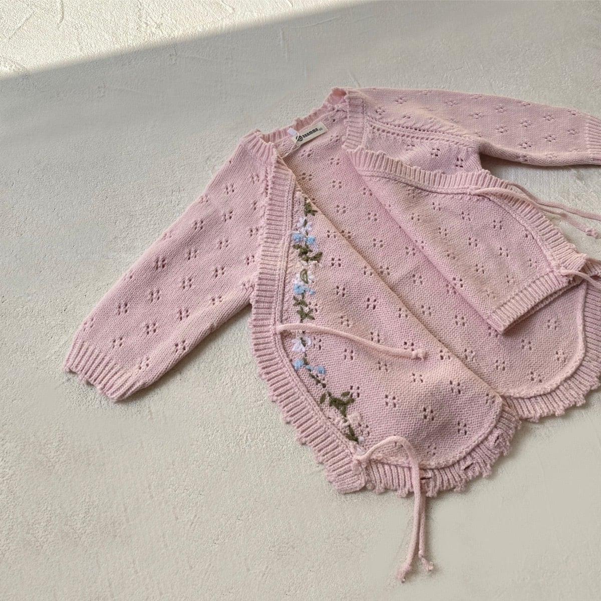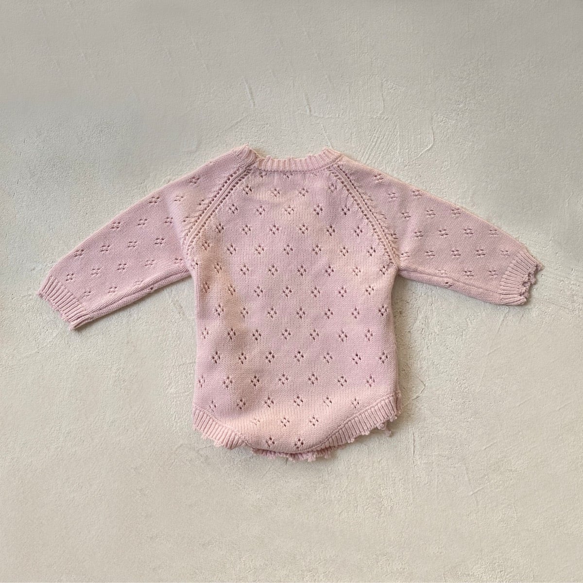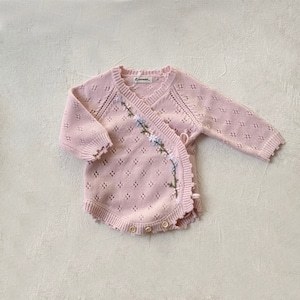 前開きデザインで赤ちゃんのお着替えもスムーズに行え、さらには透かし編みのディティールがさりげなくオシャレさを演出。