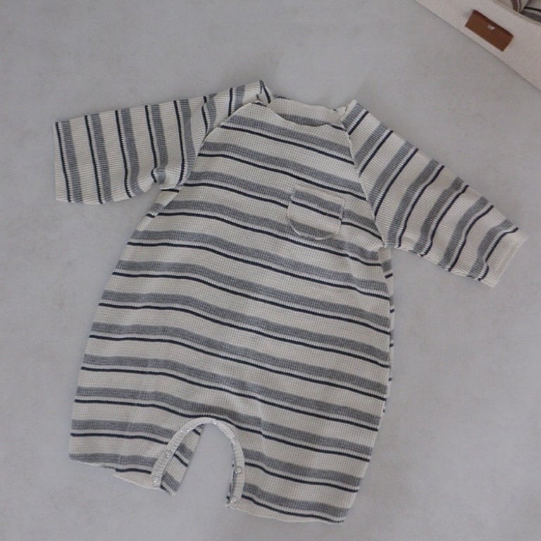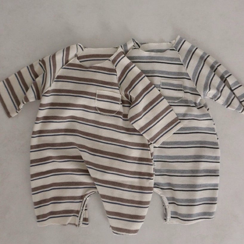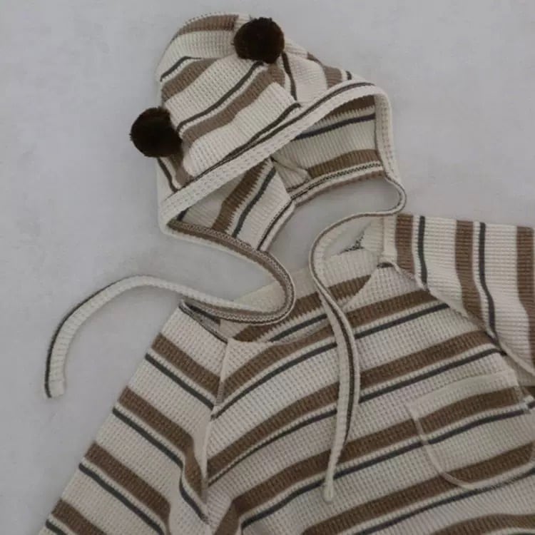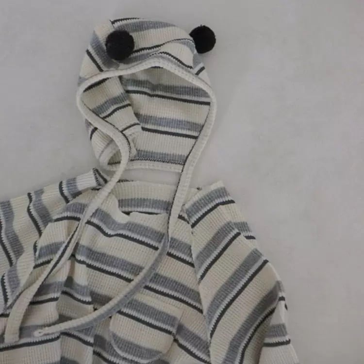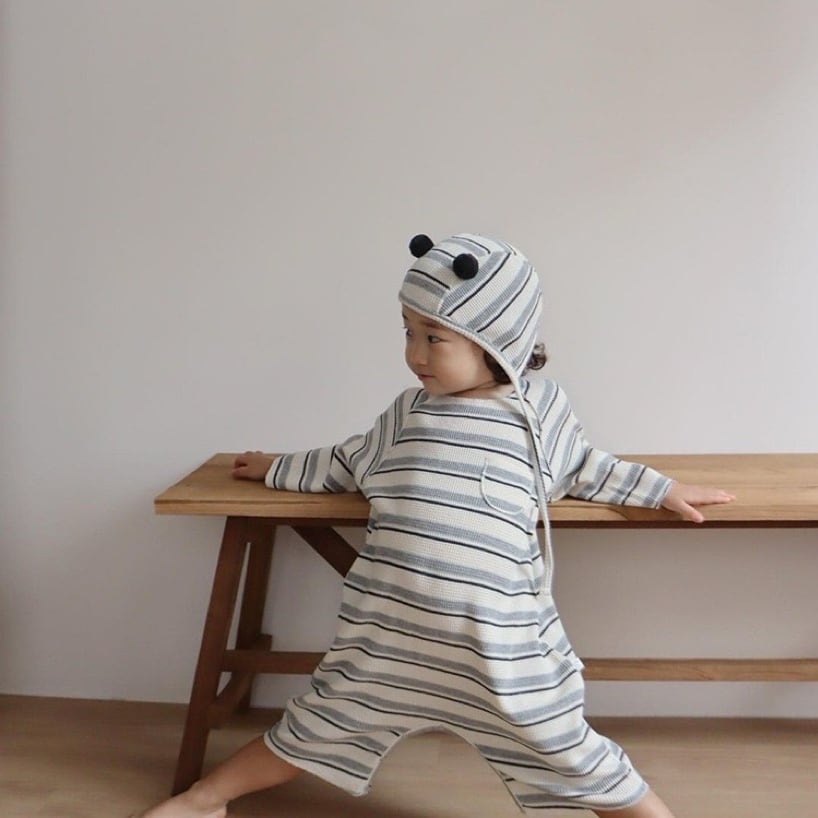 ,ポンポン帽子付きボーダーのやさしいワッフルロンパース