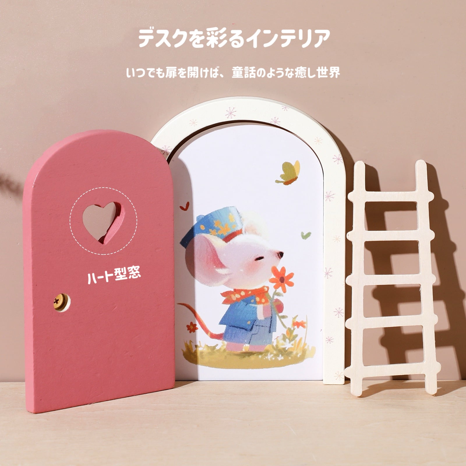 ピンクのドアにはハート型のくり抜きが施され、青いスーツを着た小さなハムスター風キャラクターが花を手にして微笑むデザインがとても愛らしいです。