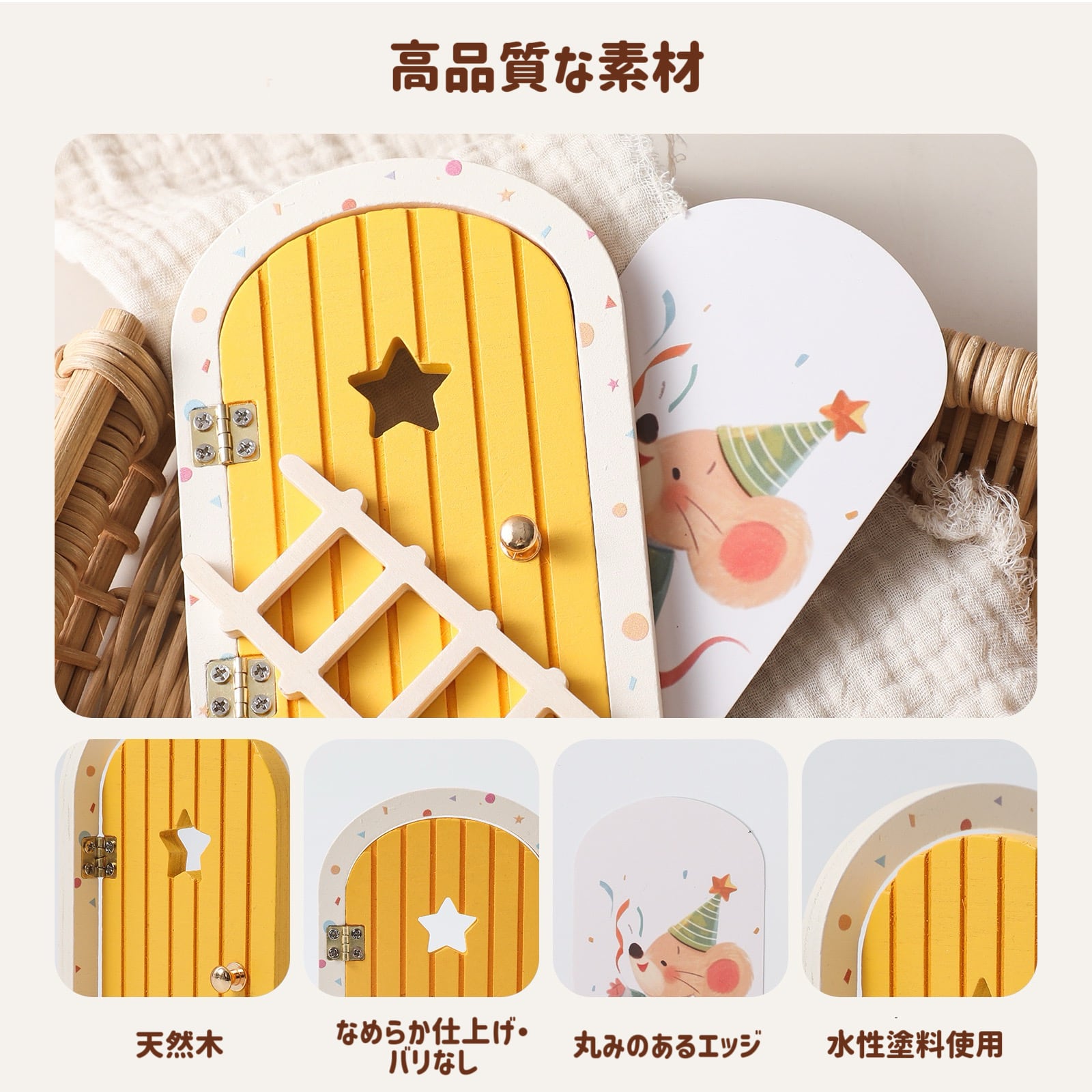 イエローのドアは星型のくり抜きがアクセントとなり、緑のお洋服を着たキャラクターが添えられ、さらに小物(抜けた乳歯など)を入れられる小さなボックス付きで、遊びの幅が広がります。
