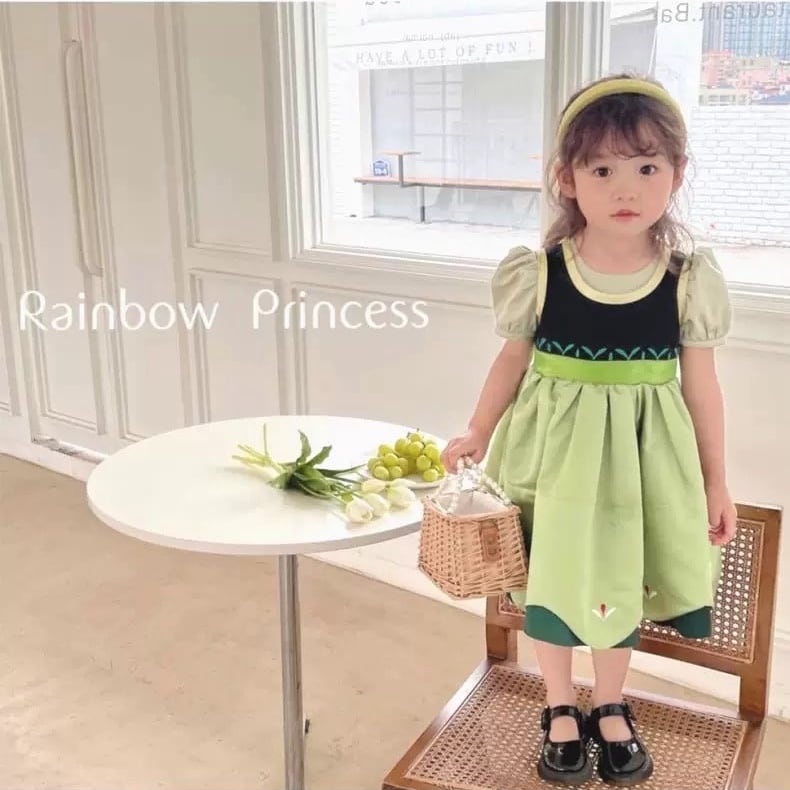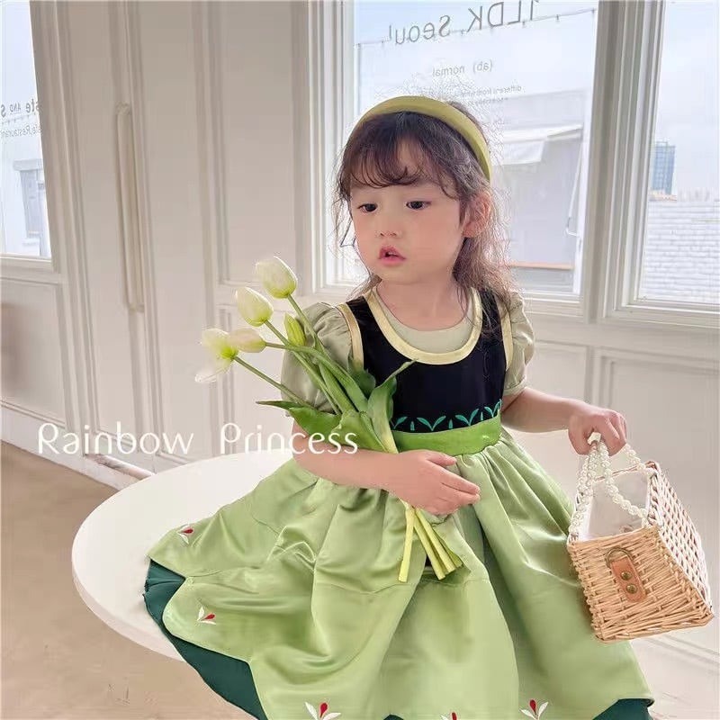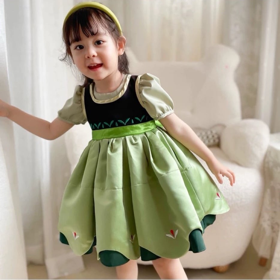 Aラインのふんわり広がるグリーンのスカートが優雅に揺れ、上部はブラック×イエローの縁取りでシックかつ華やかにまとめられています。