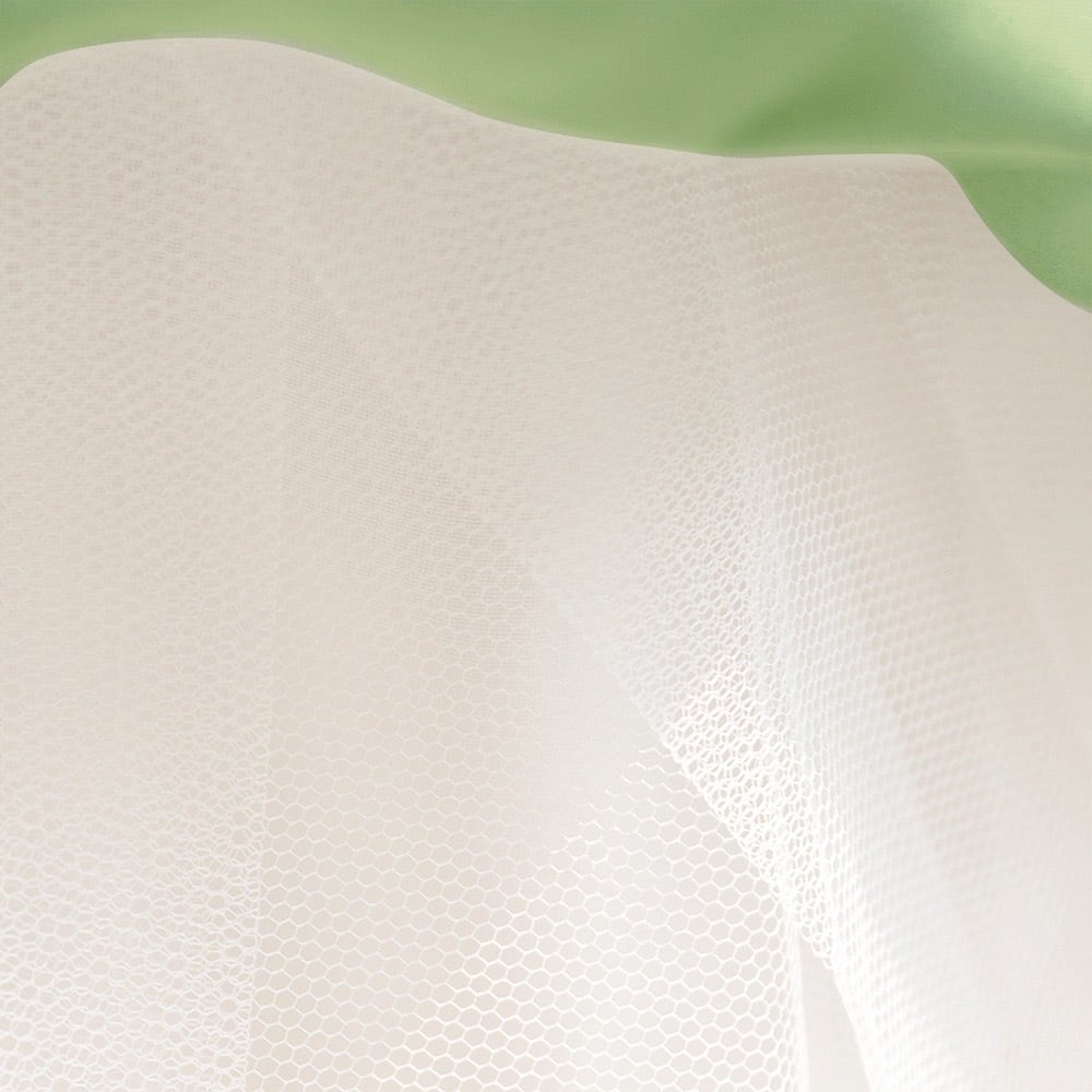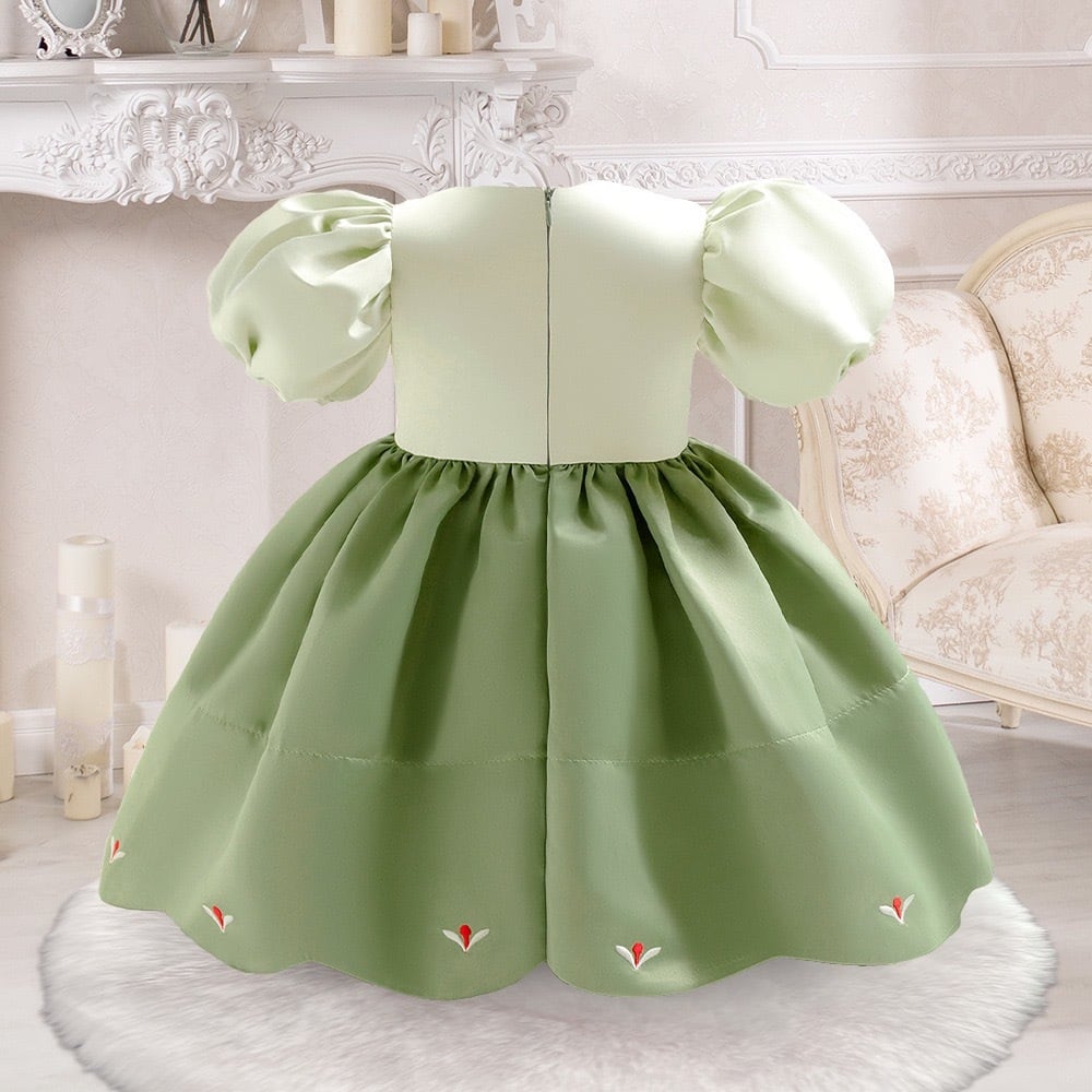 ウエストには繊細なグリーン刺繍の可愛らしい装飾が輝き、裾には花モチーフが愛らしく散りばめられます。