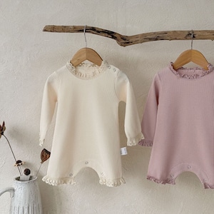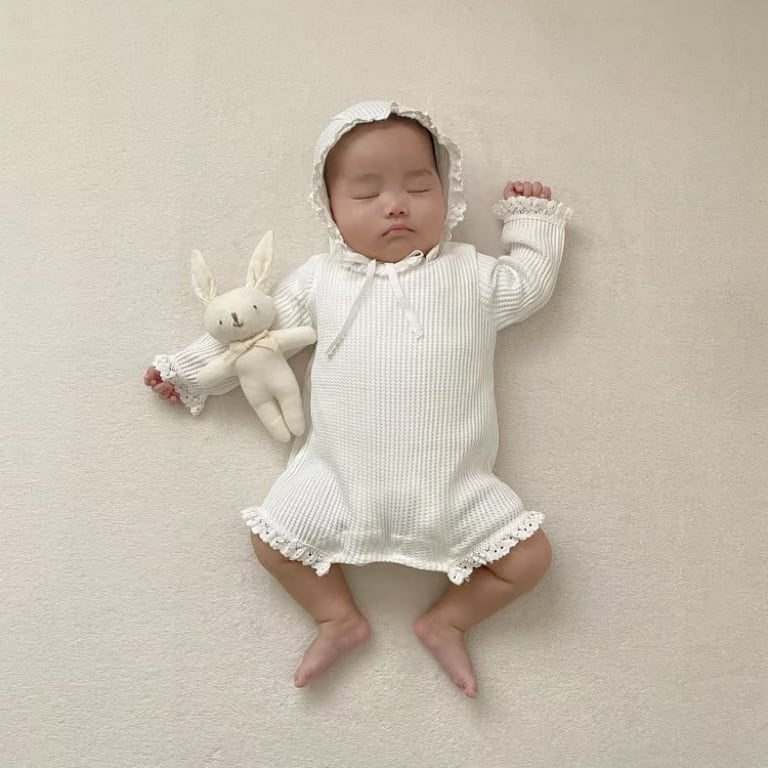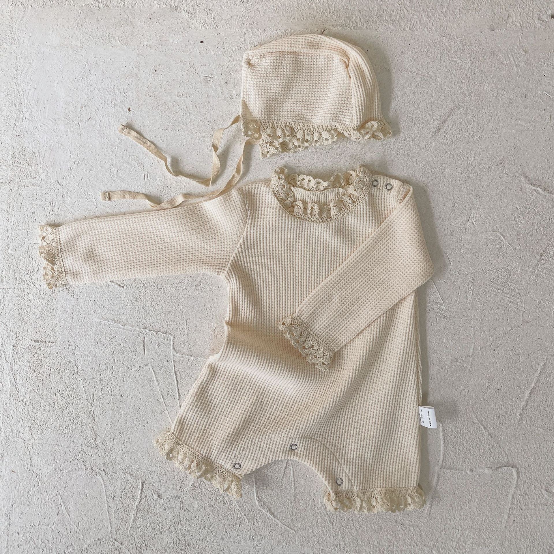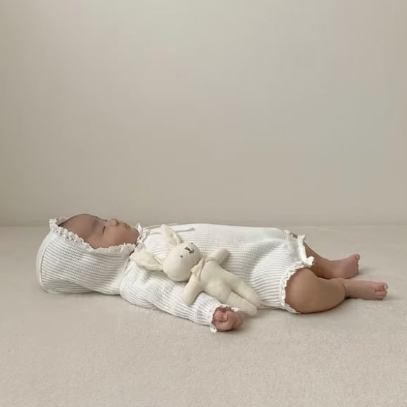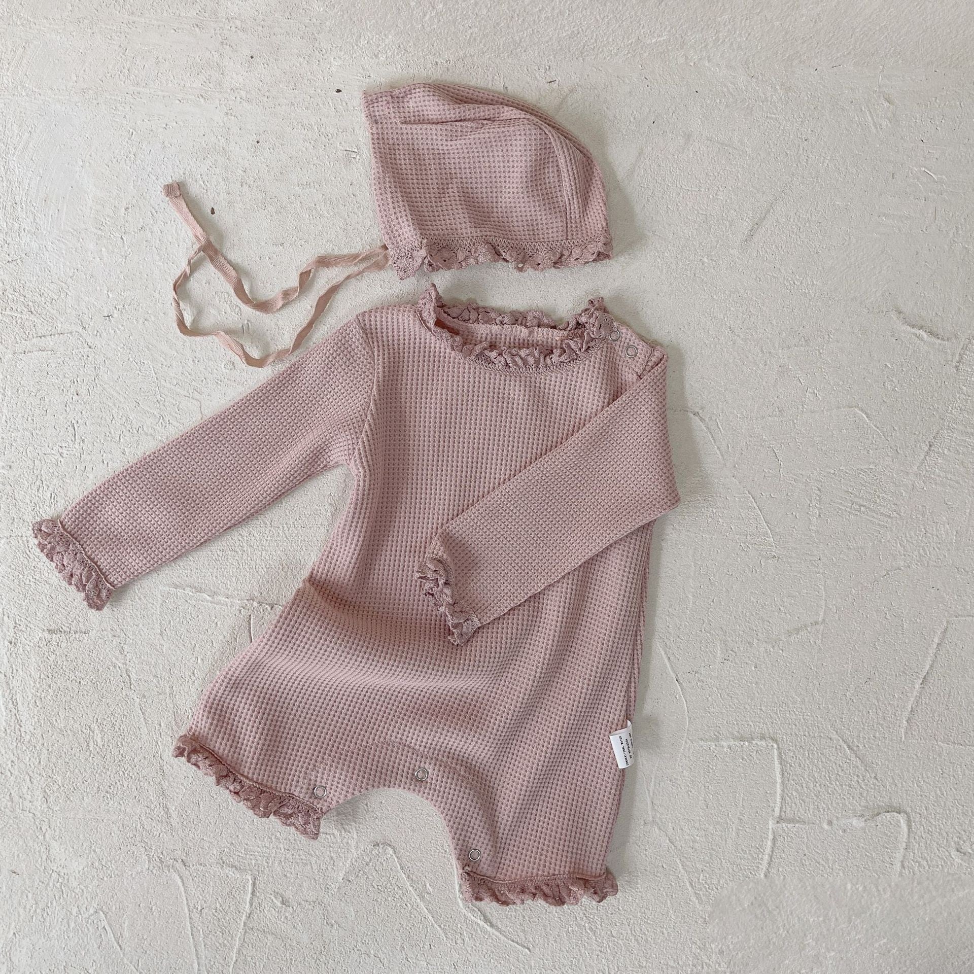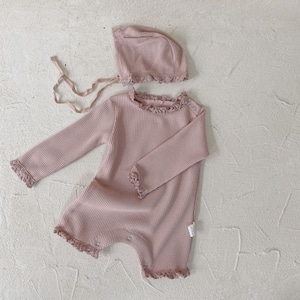 ,フリルが愛らしいワッフルロンパース(ボンネット付き)