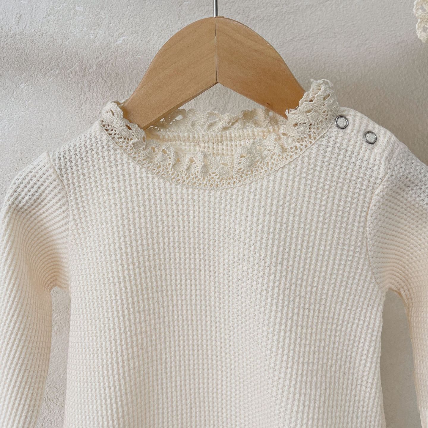 袖口と襟元には繊細なフリルがあしらわれ、動くたびにふわっと揺れて、愛らしさと華やかさを同時に演出します。