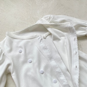袖口と足首をふんわりフリルで飾り、正面の斜めボタン開きがとってもおしゃれで新鮮。
