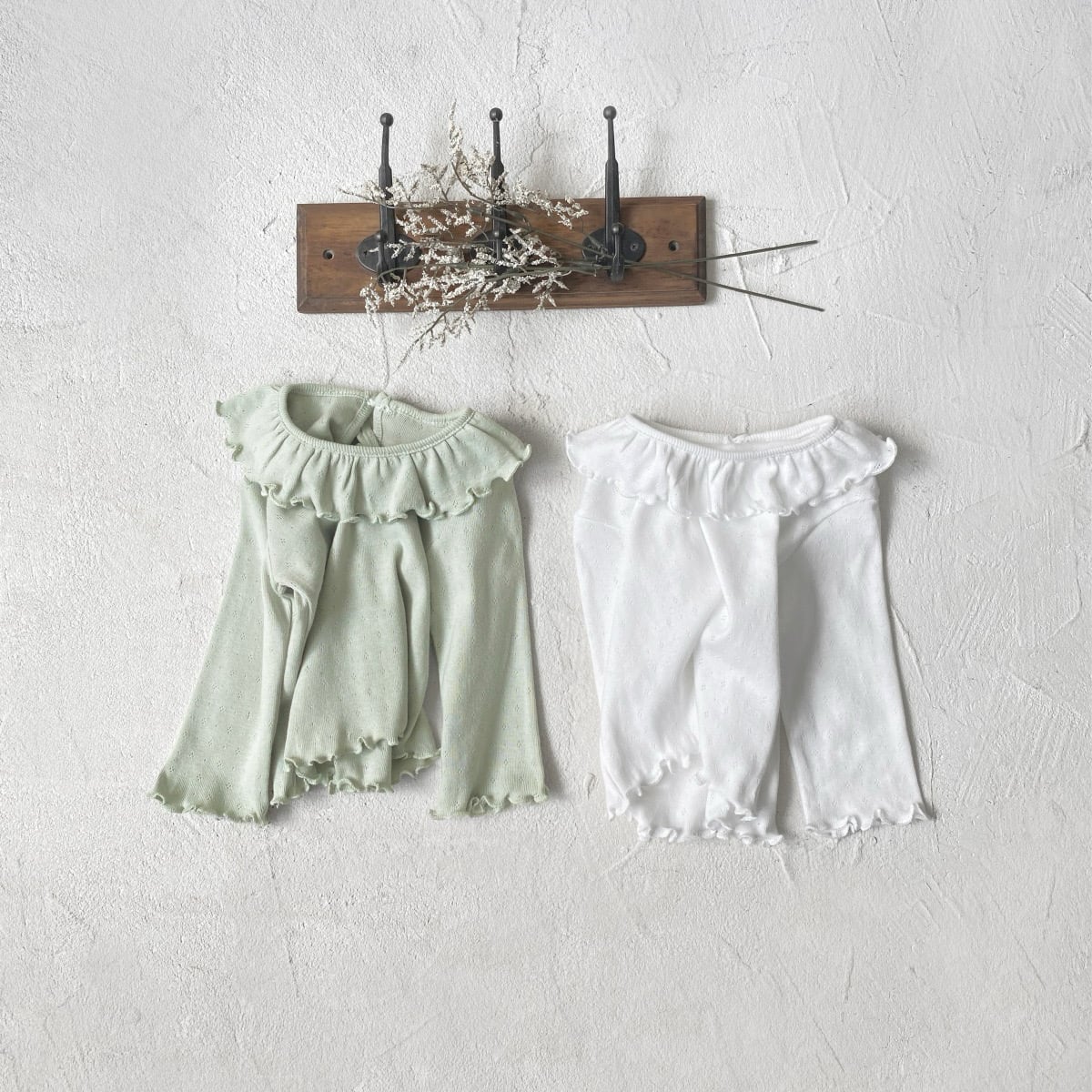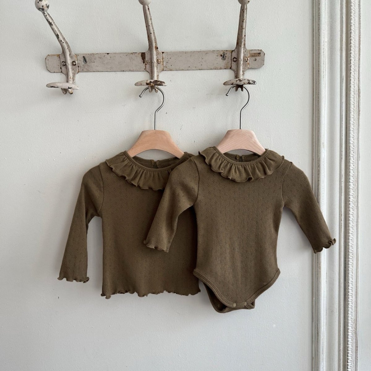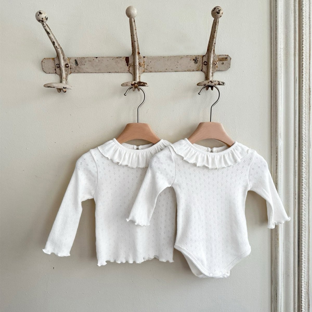 ,フリル襟が映える長袖Tシャツとロンパースの姉妹コーデ