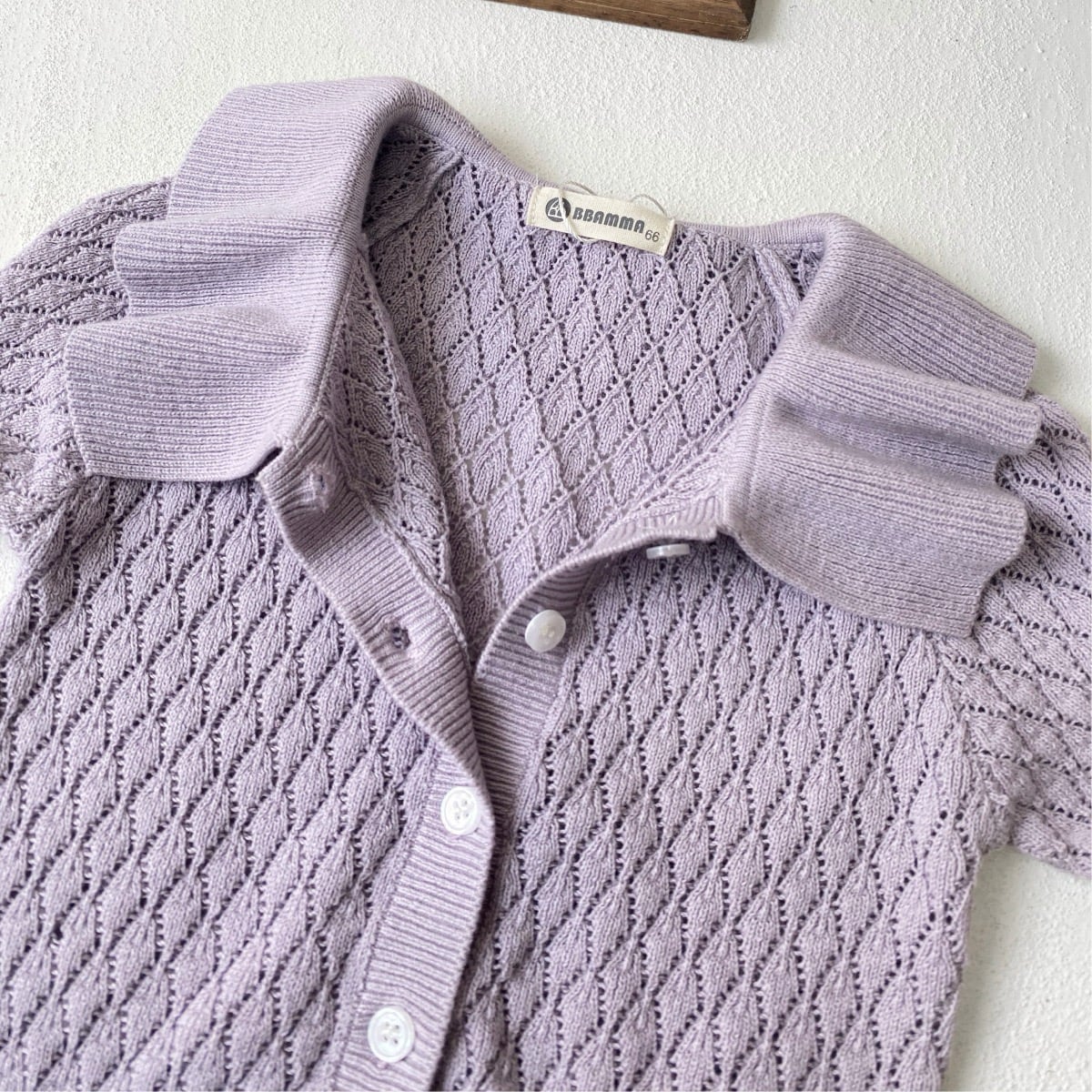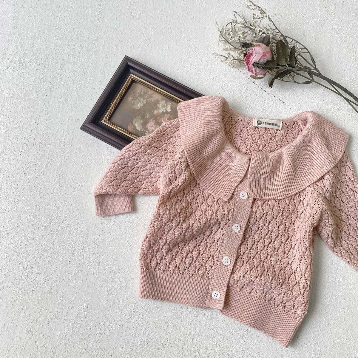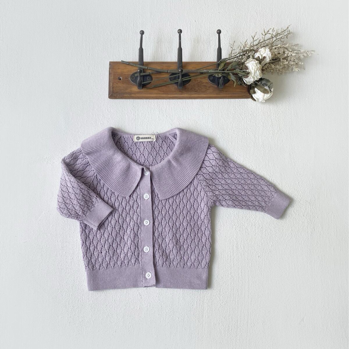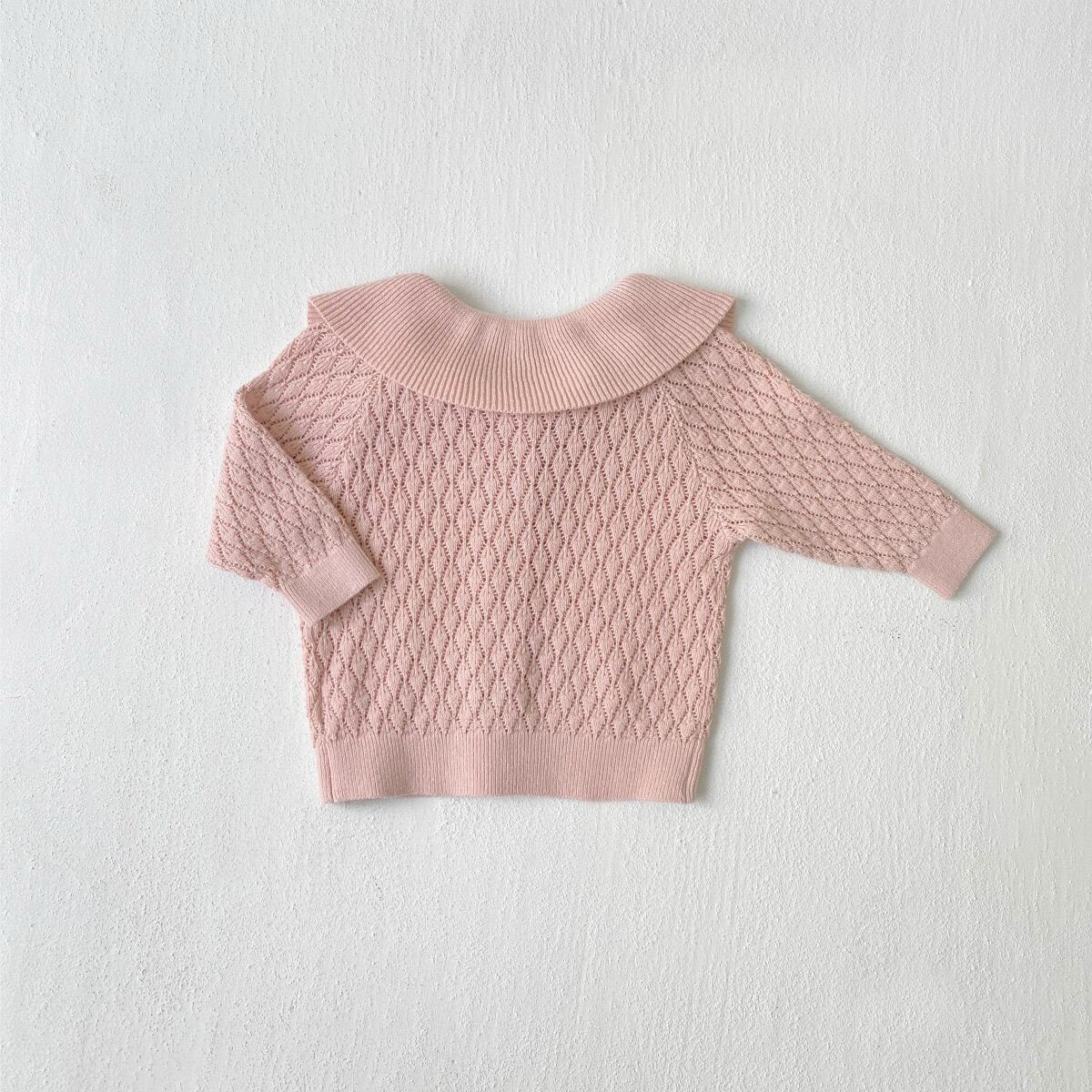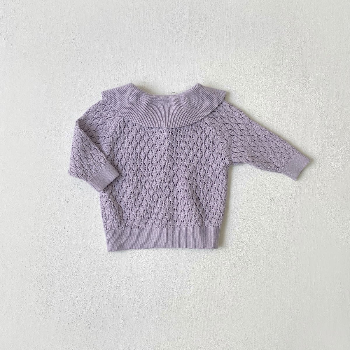 ,ビッグフリル襟がかわいい透かし編み女の子ニットカーディガン
