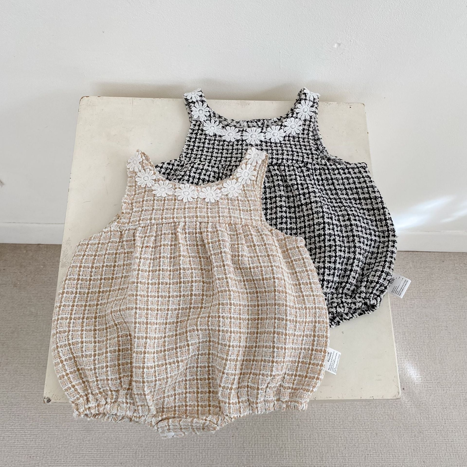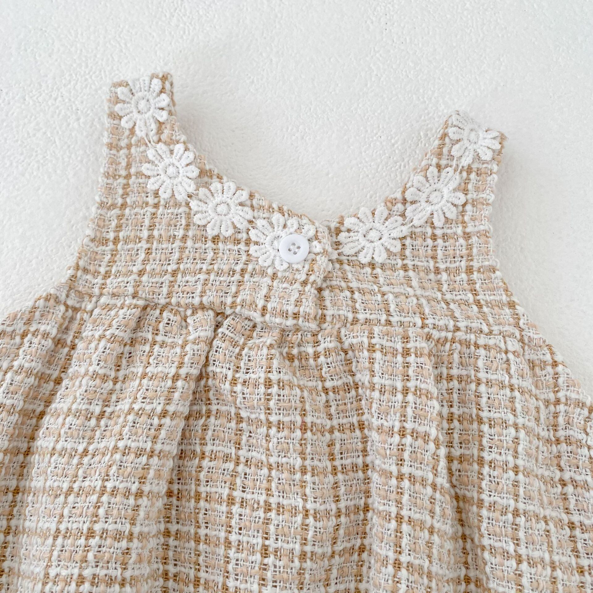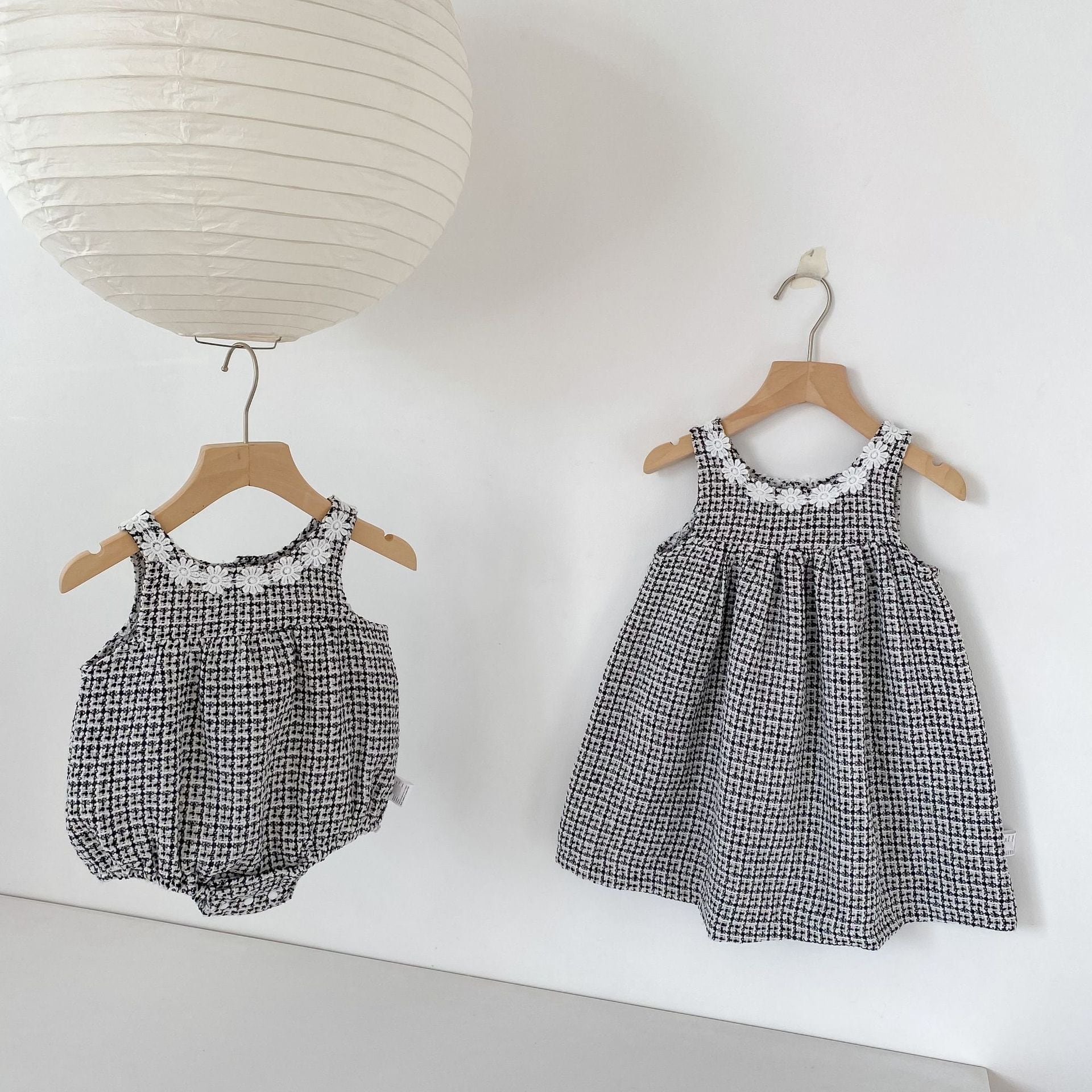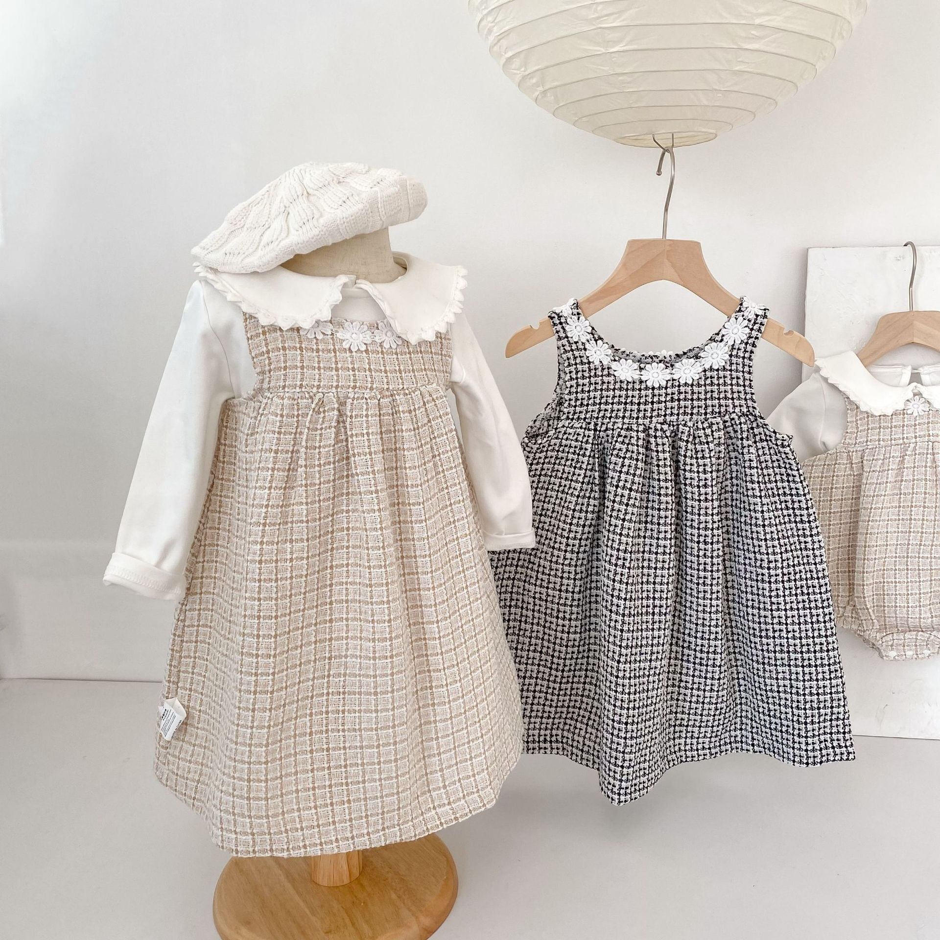 可愛らしいロンパースと上品なワンピースの2種類をご用意し、どちらもファッションセンスを高めるチェック柄ツイード生地を採用しています。