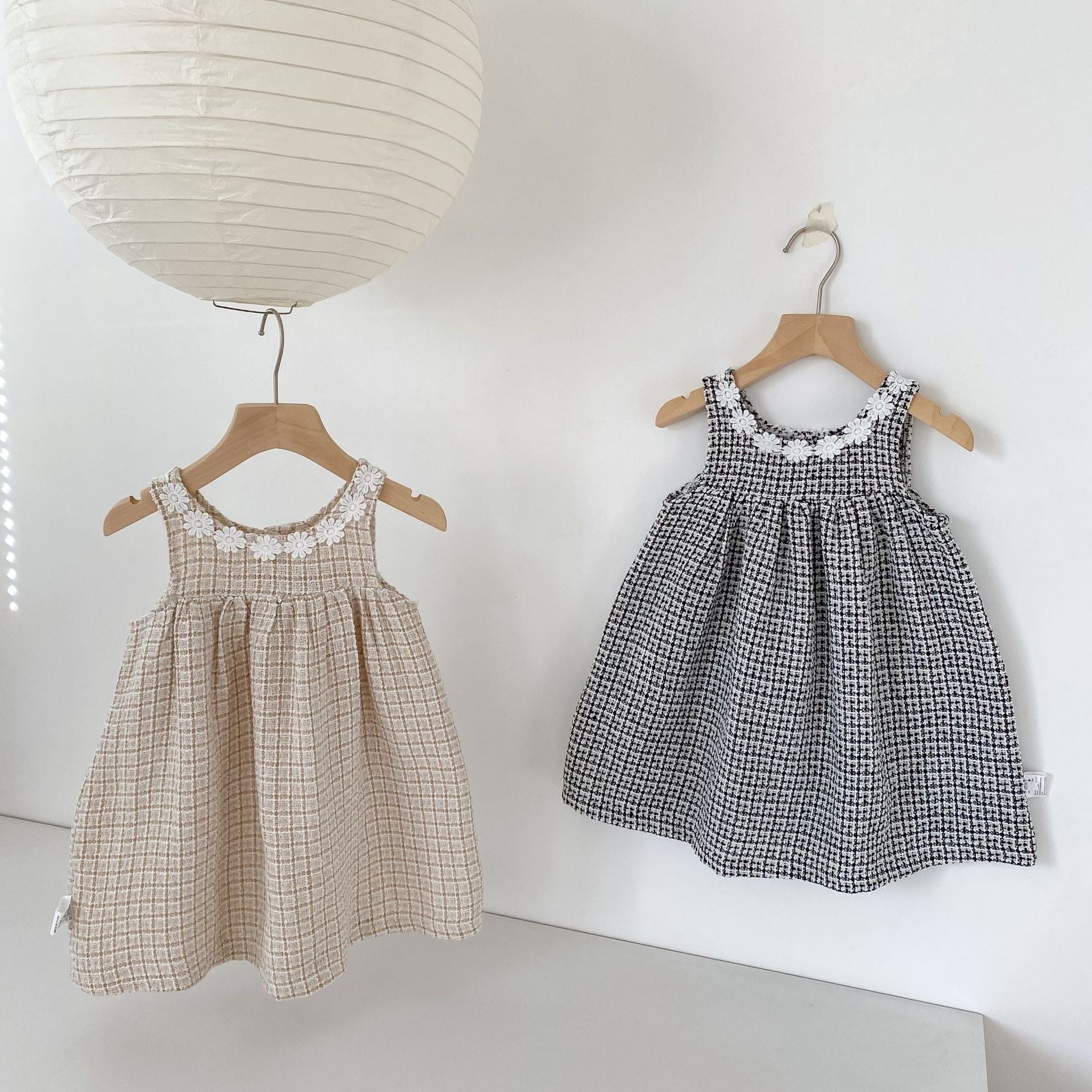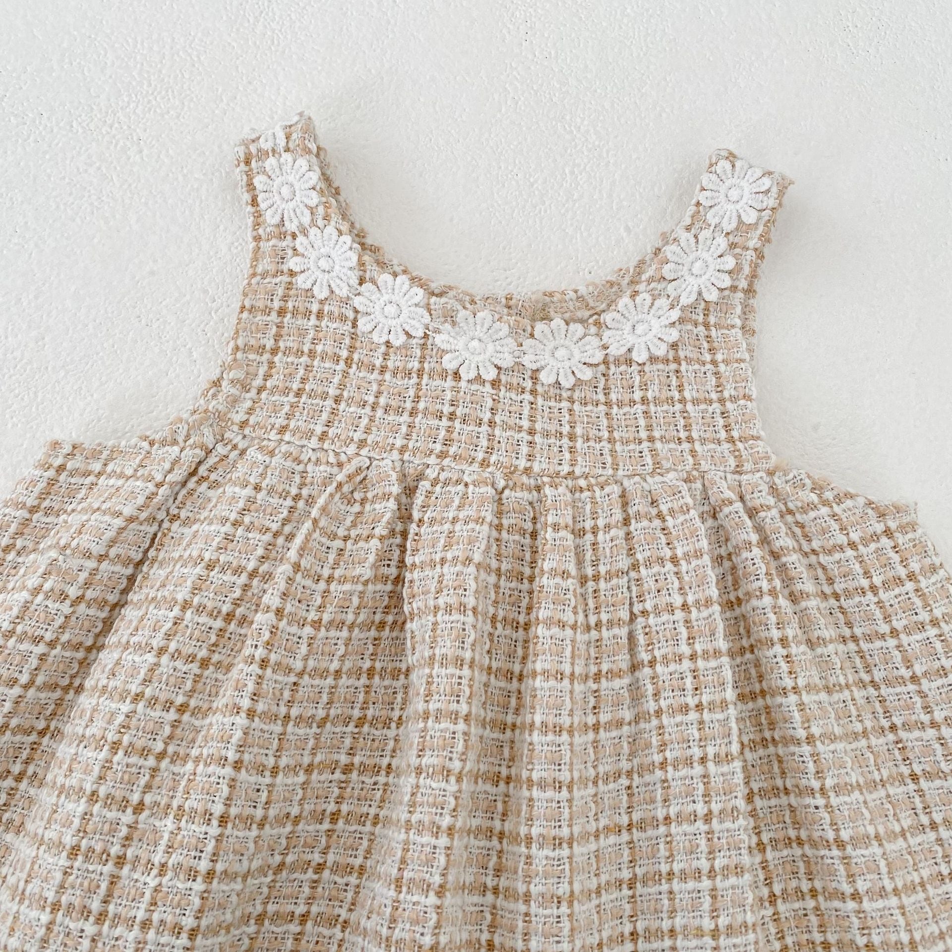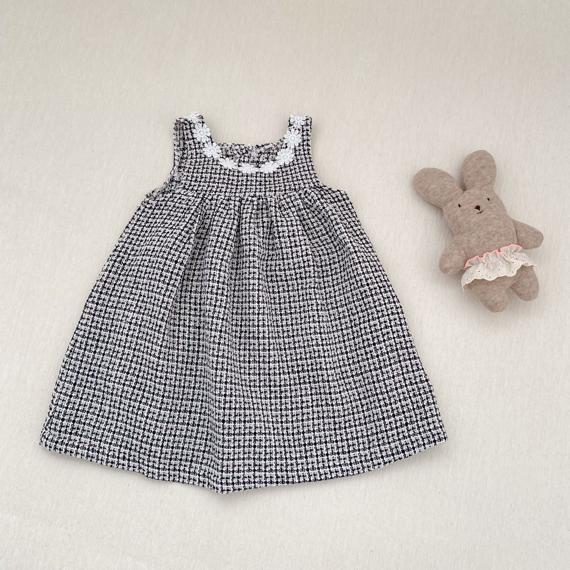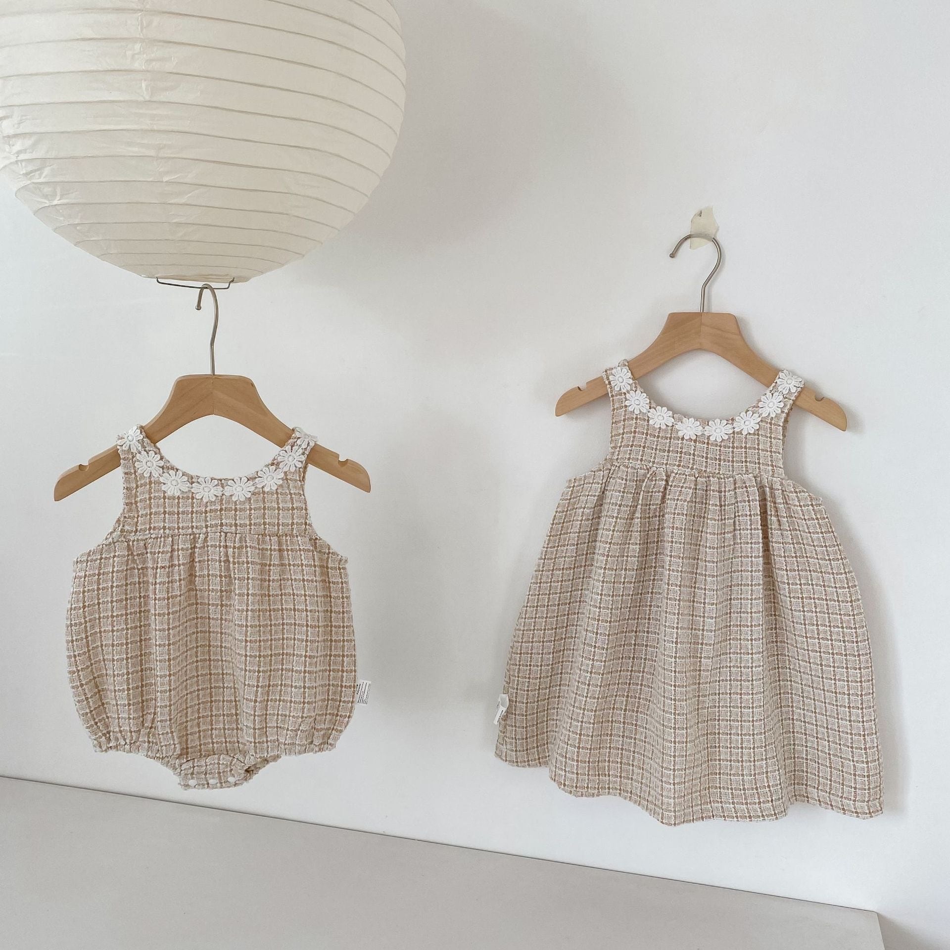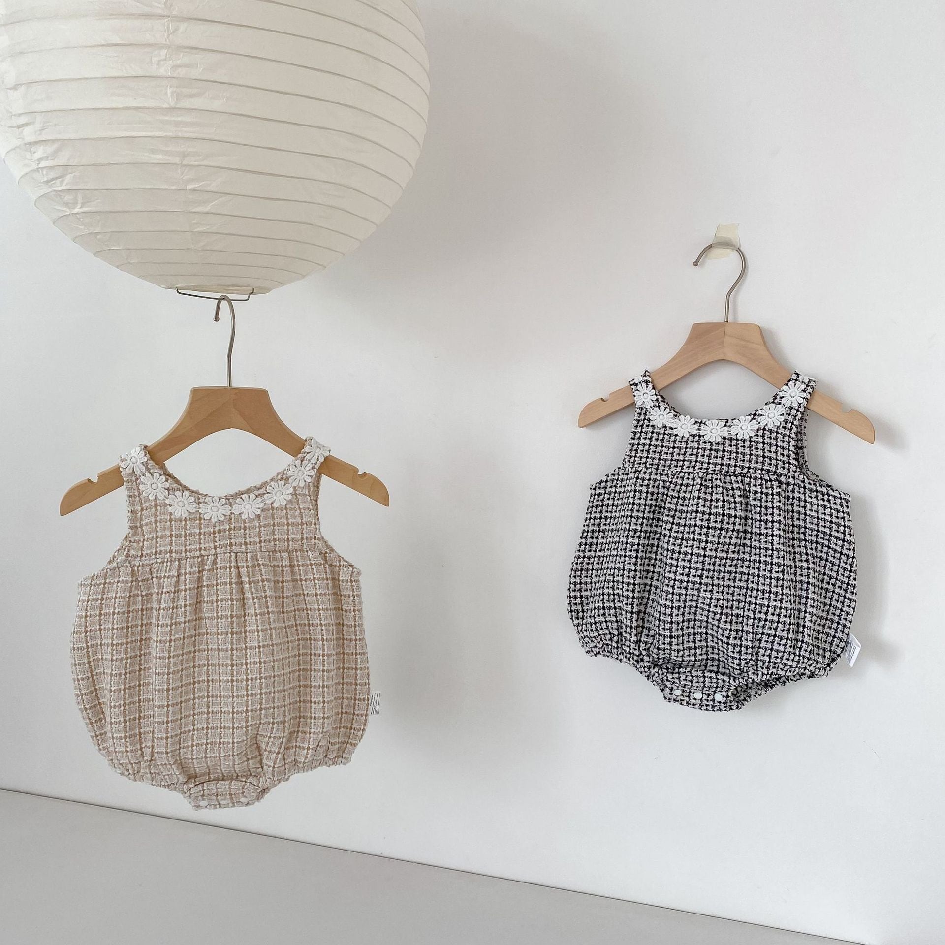 可愛らしいロンパースと上品なワンピースの2種類をご用意し、どちらもファッションセンスを高めるチェック柄ツイード生地を採用しています。