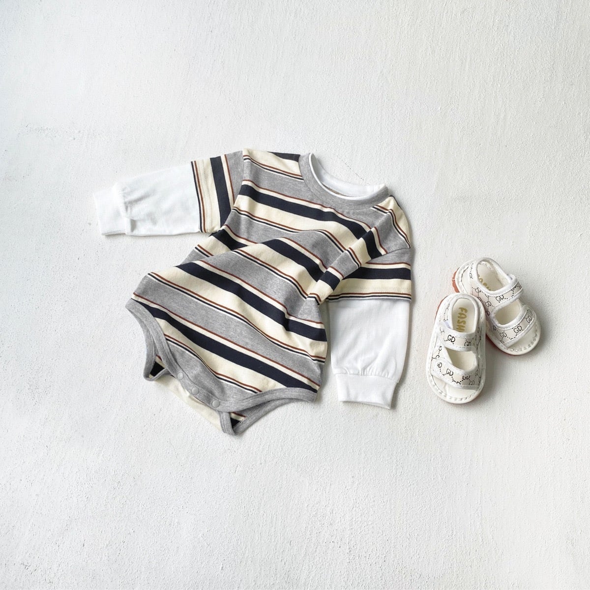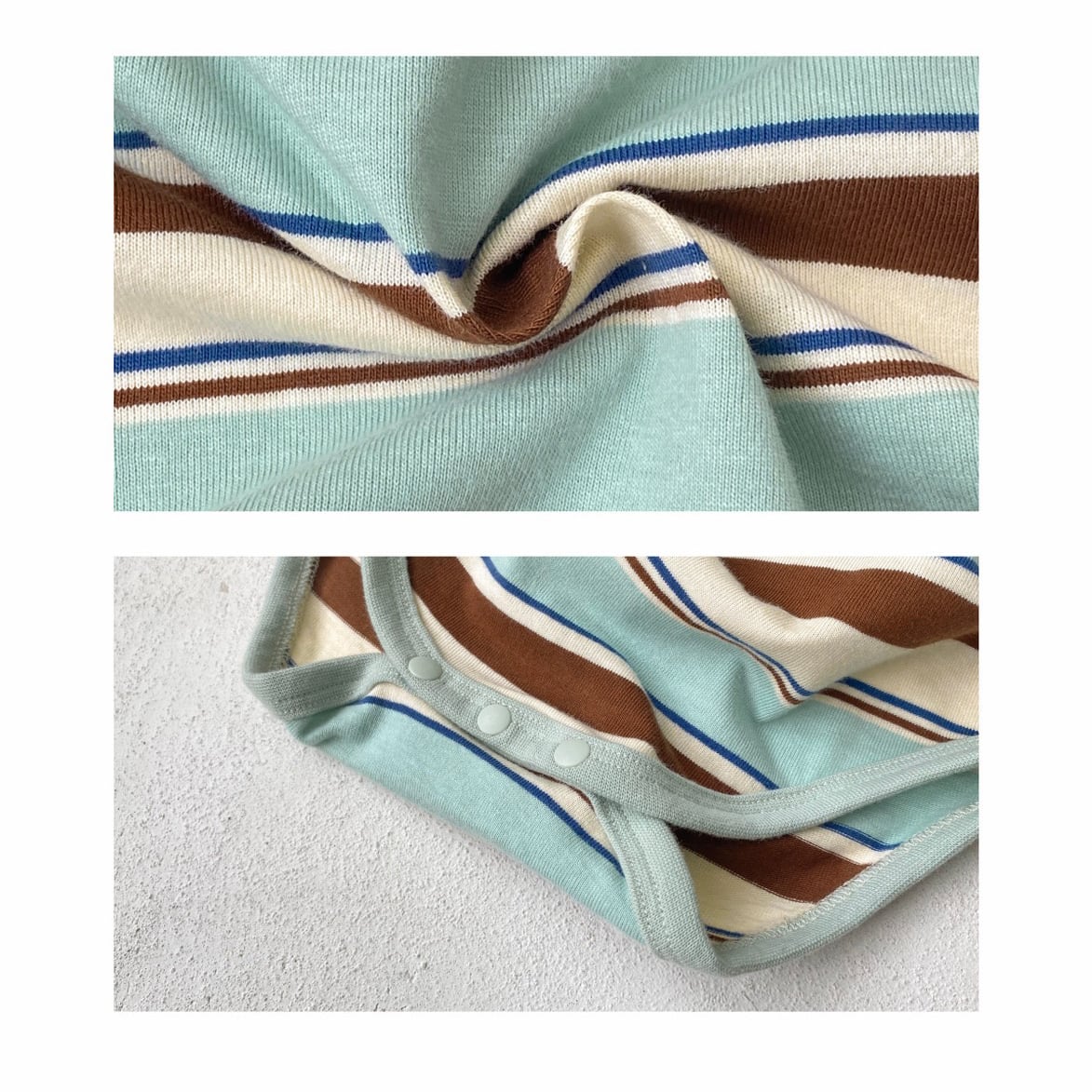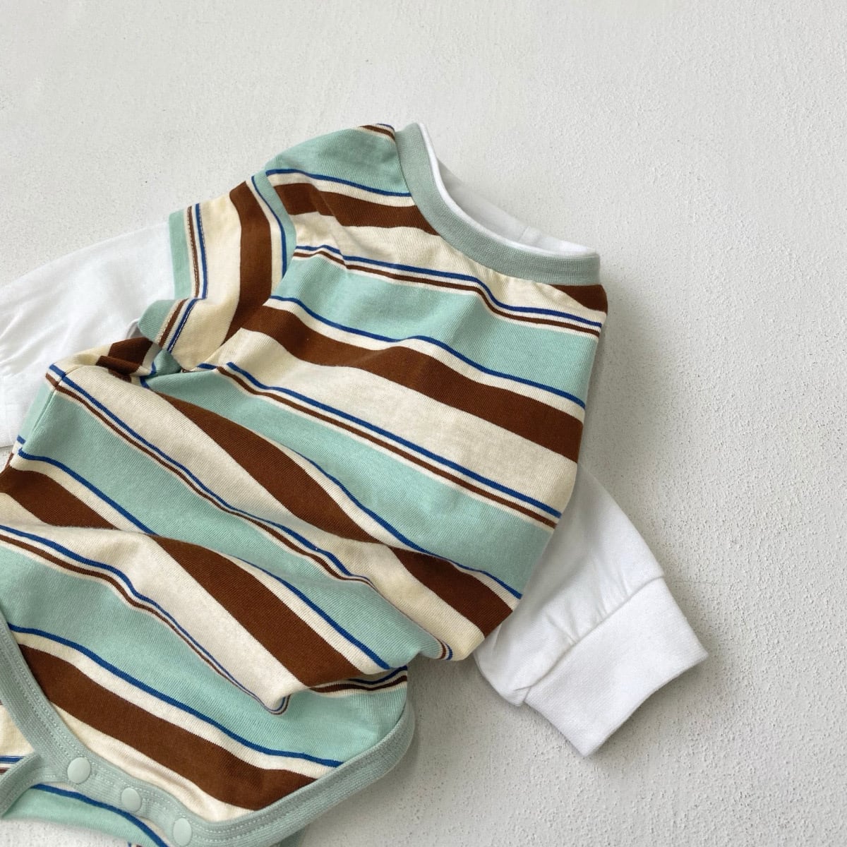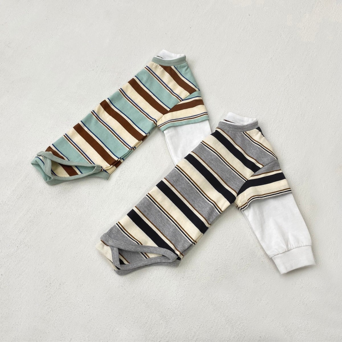 ,綿100%のボーダー重ね着風ベビーロンパース
