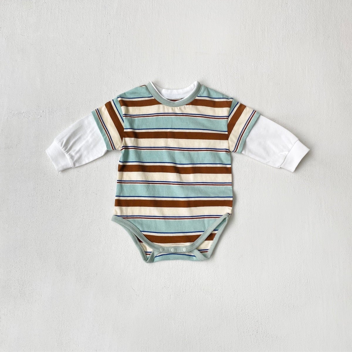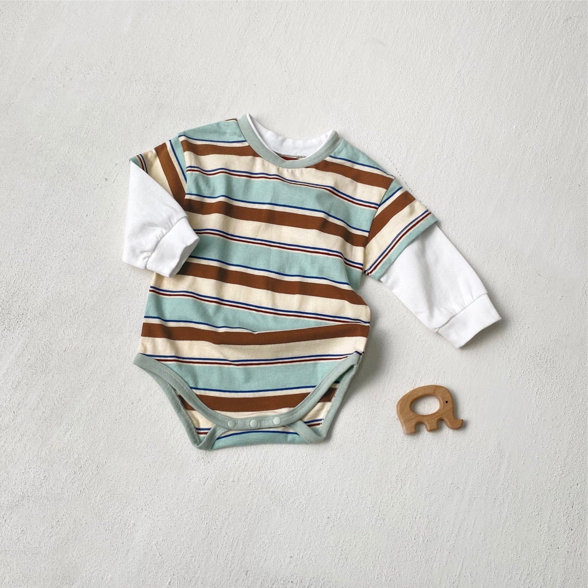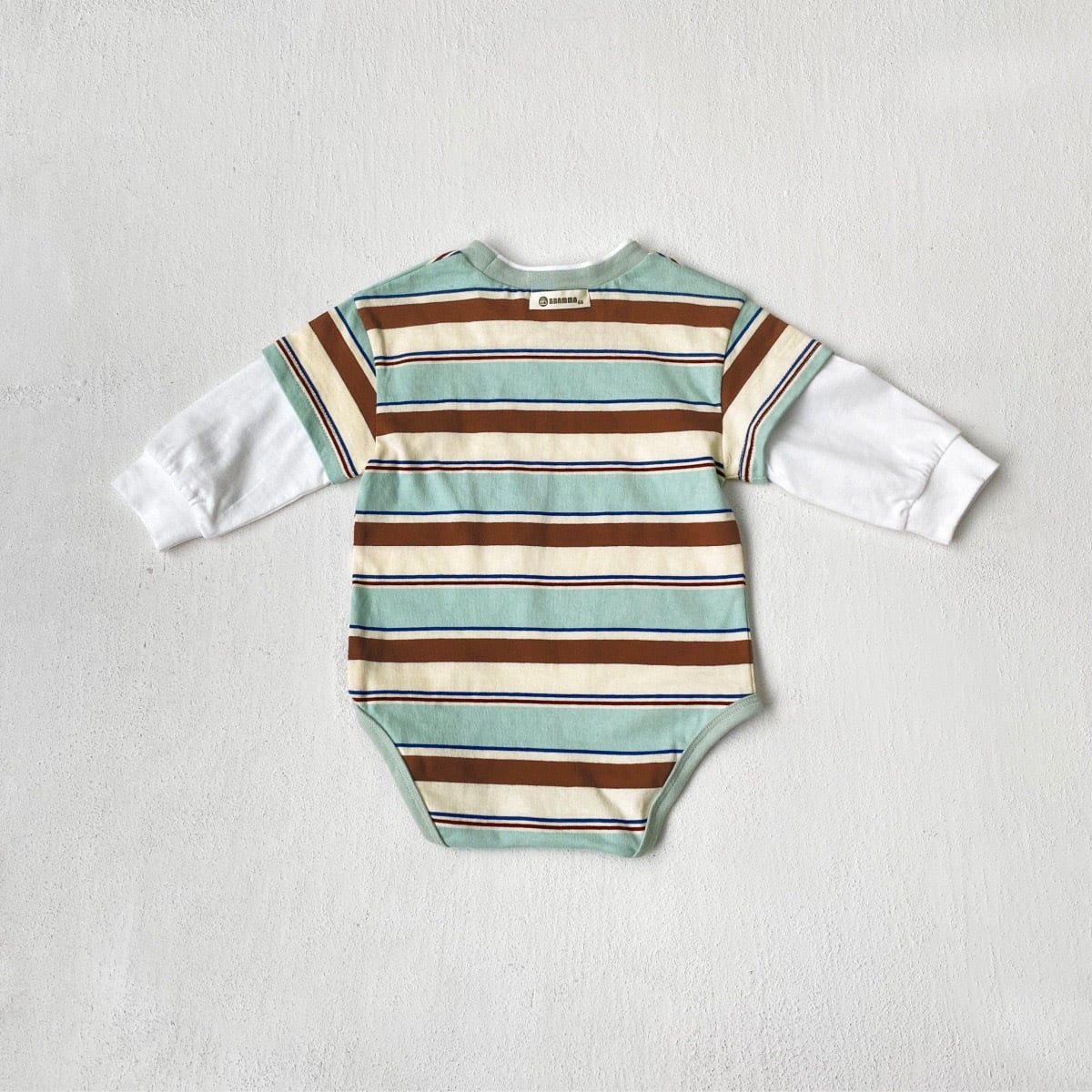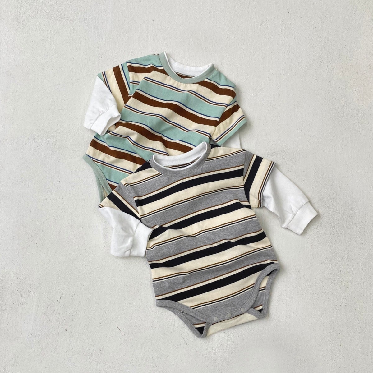 ,綿100%のボーダー重ね着風ベビーロンパース