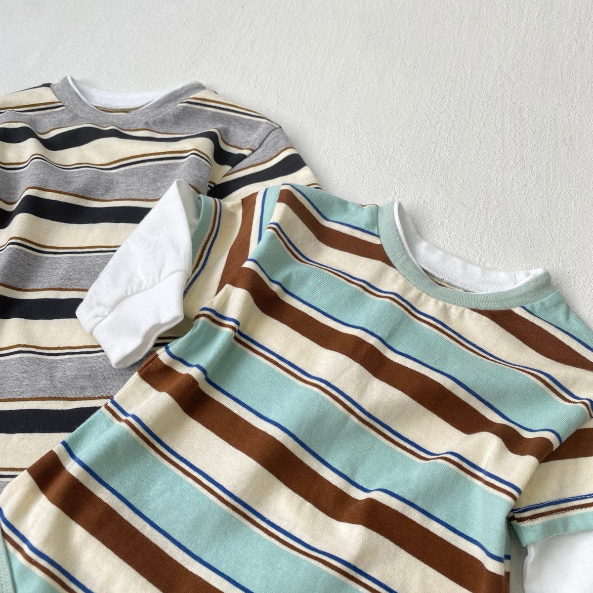 どちらも白い無地の袖との組み合わせで、まるで“重ね着しているような”おしゃれな仕上がり。