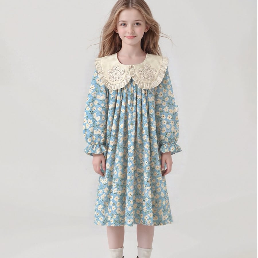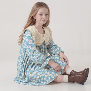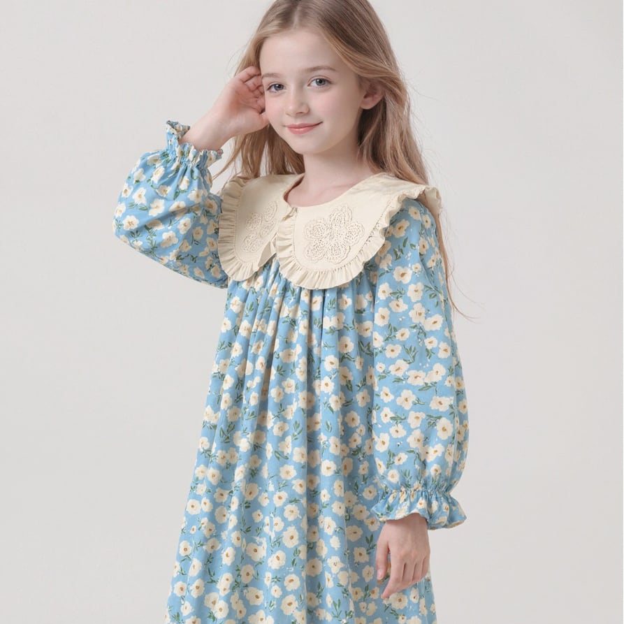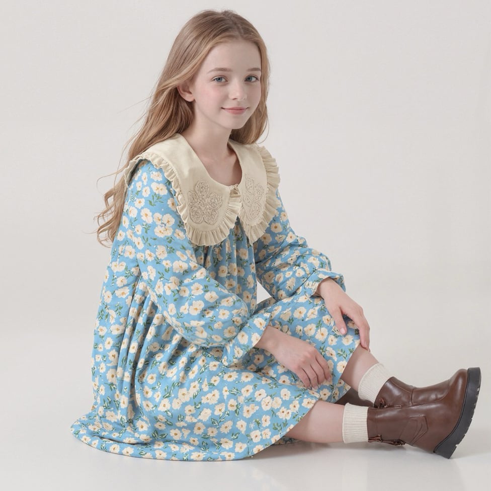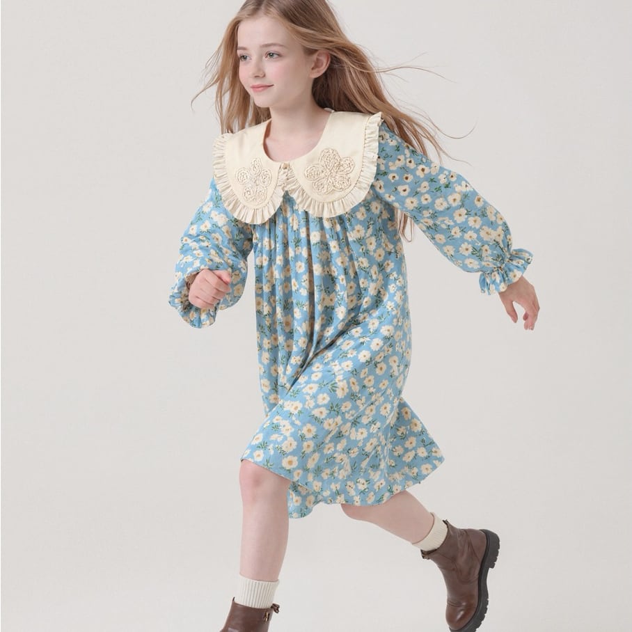 襟元には上品なホワイト丸襟があしらわれ、さらに2つの透かし花モチーフがアクセントとなり、可愛らしさを一層引き立てます。