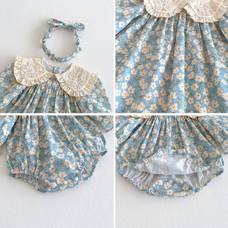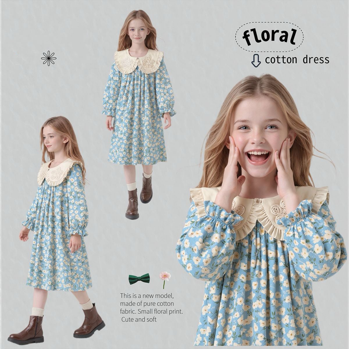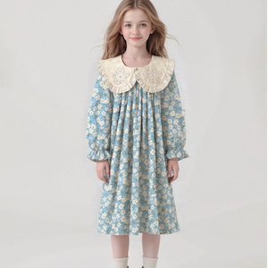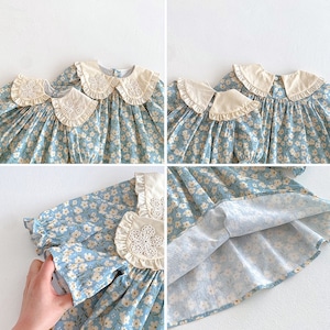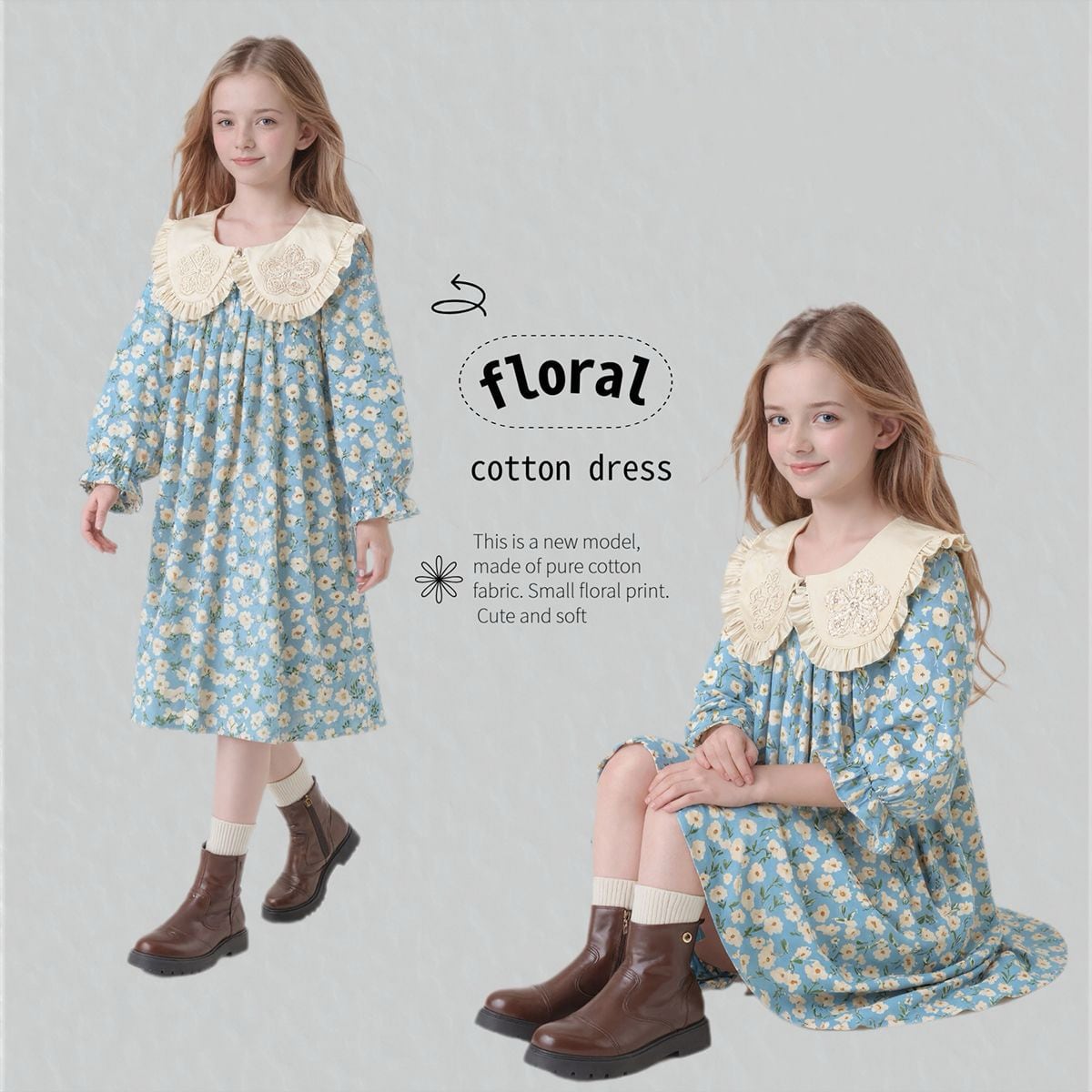 襟元には上品なホワイト丸襟があしらわれ、さらに2つの透かし花モチーフがアクセントとなり、可愛らしさを一層引き立てます。