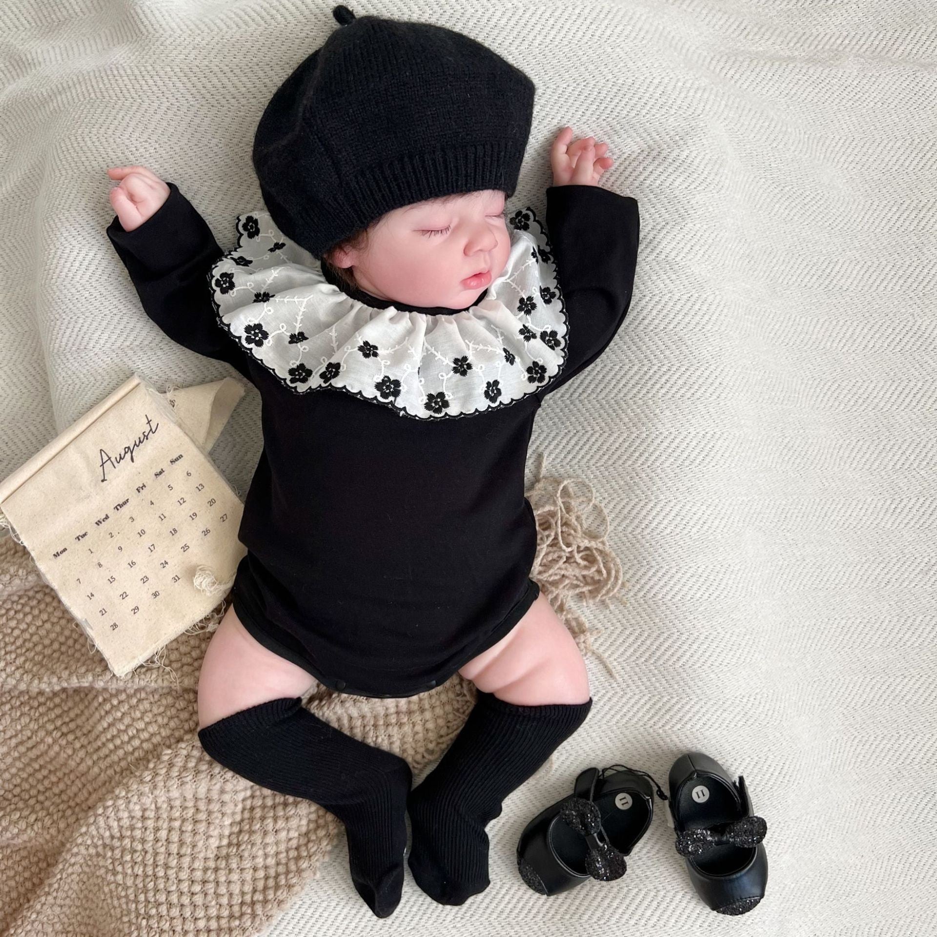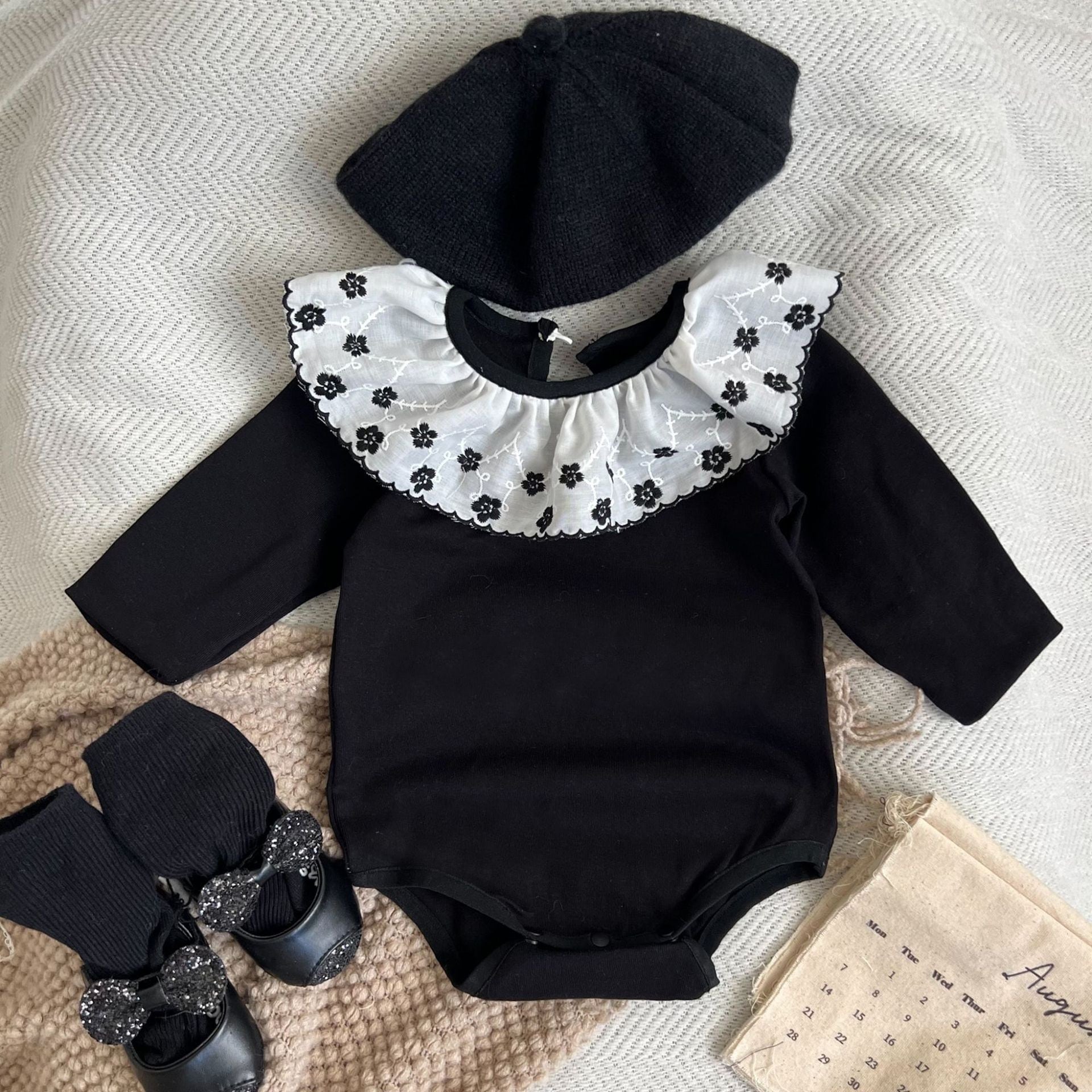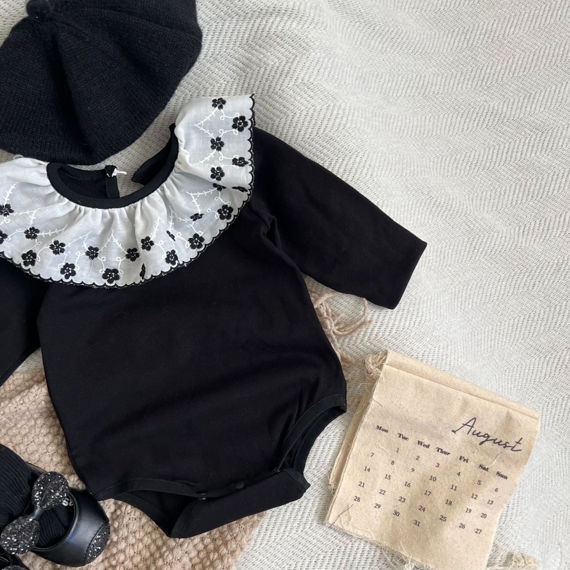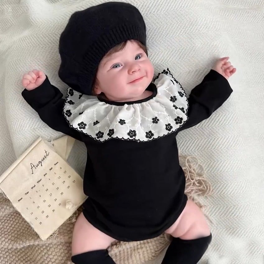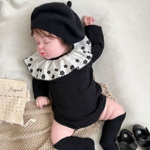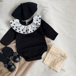 ,花柄フリル襟付きブラックベビーロンパース