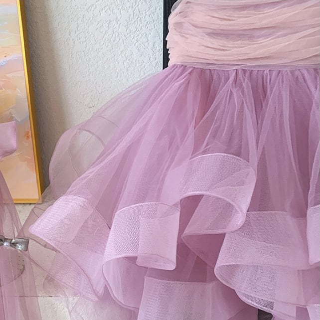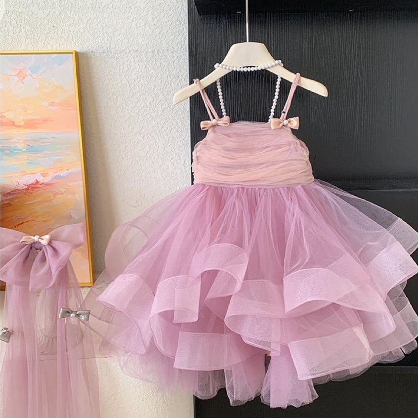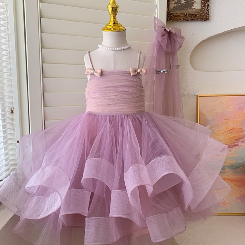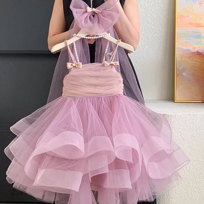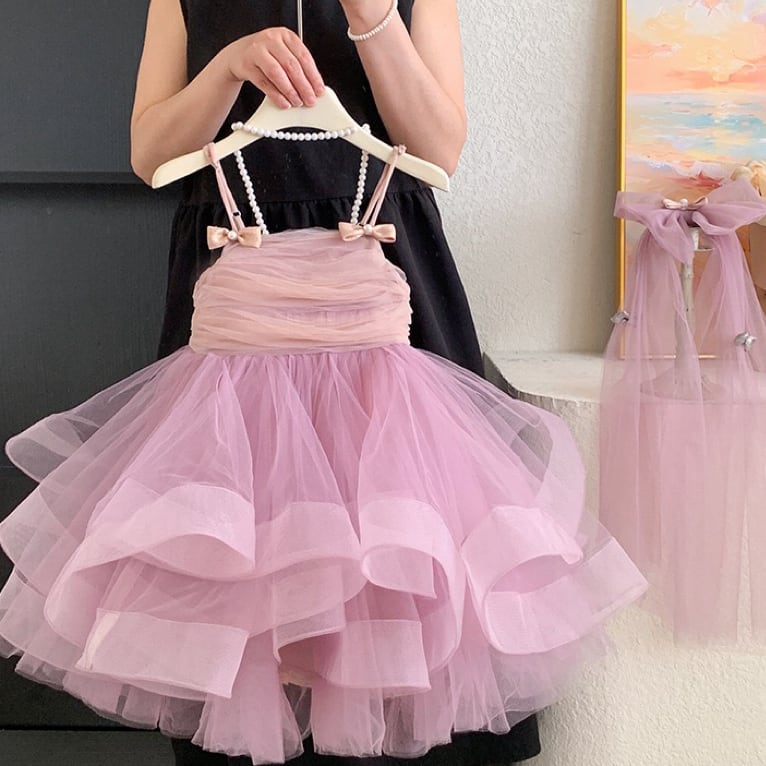ふんわりと広がるボリューム感たっぷりの2段チュールスカートが印象的で、歩くたびに軽やかに揺れ、存在感抜群の美しいシルエットを生み出します。