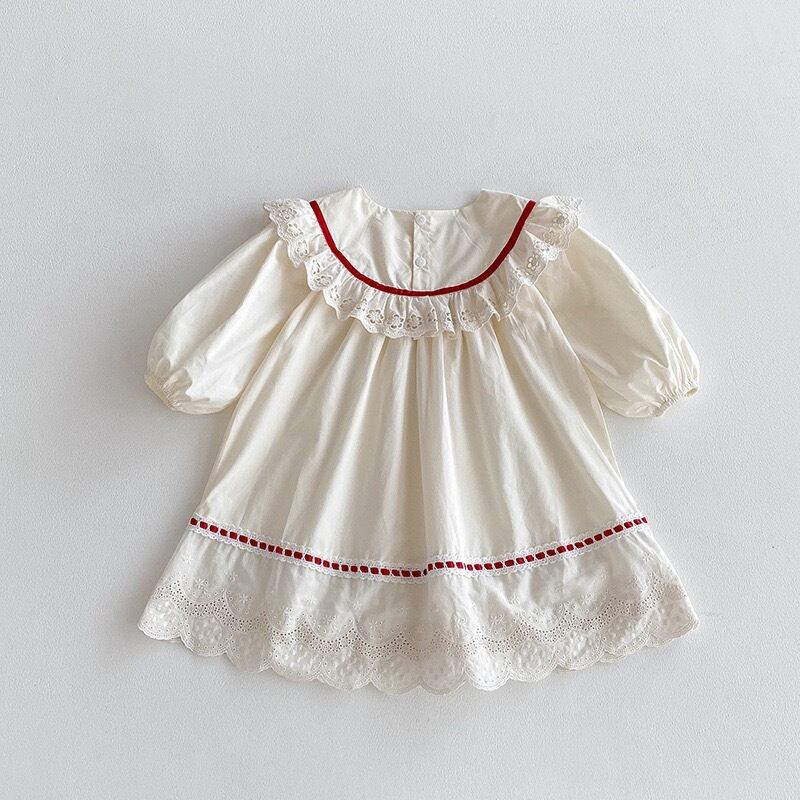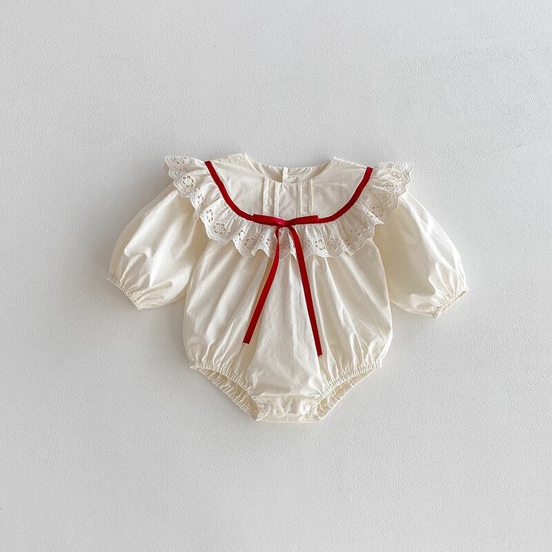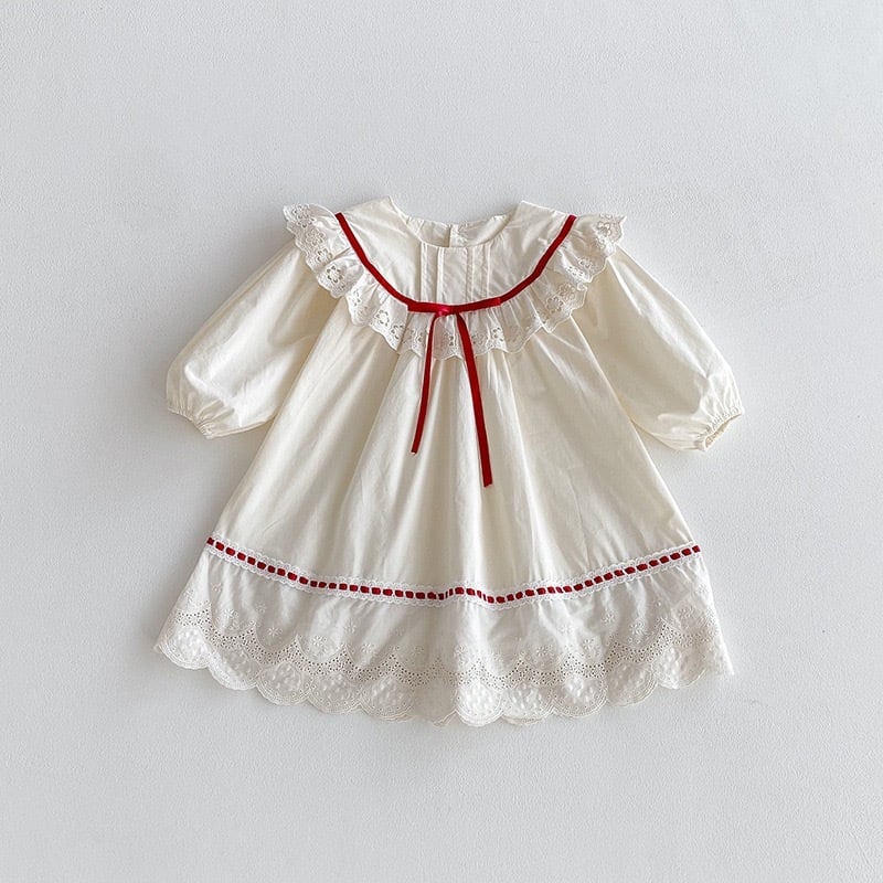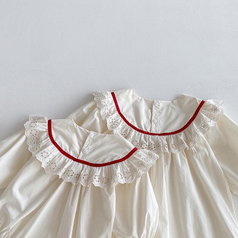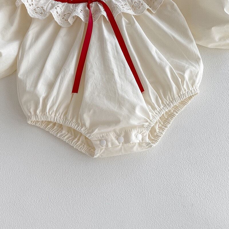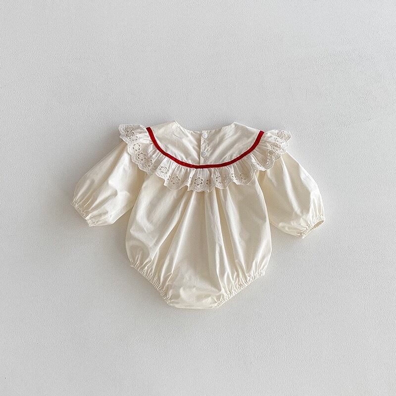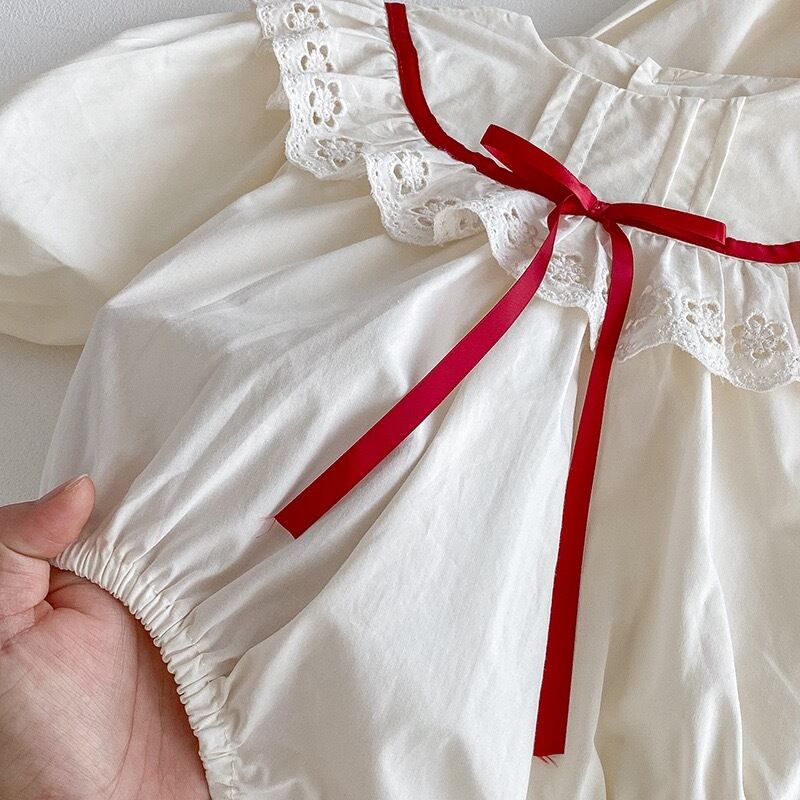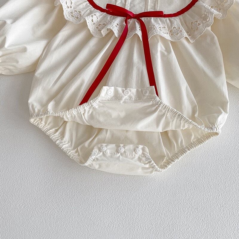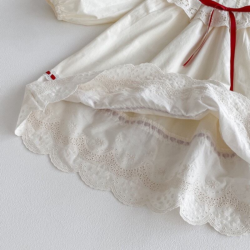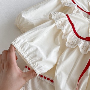 やさしいアイボリーカラーをベースに、襟元には繊細な透かし刺繍のフリルがあしらわれ、