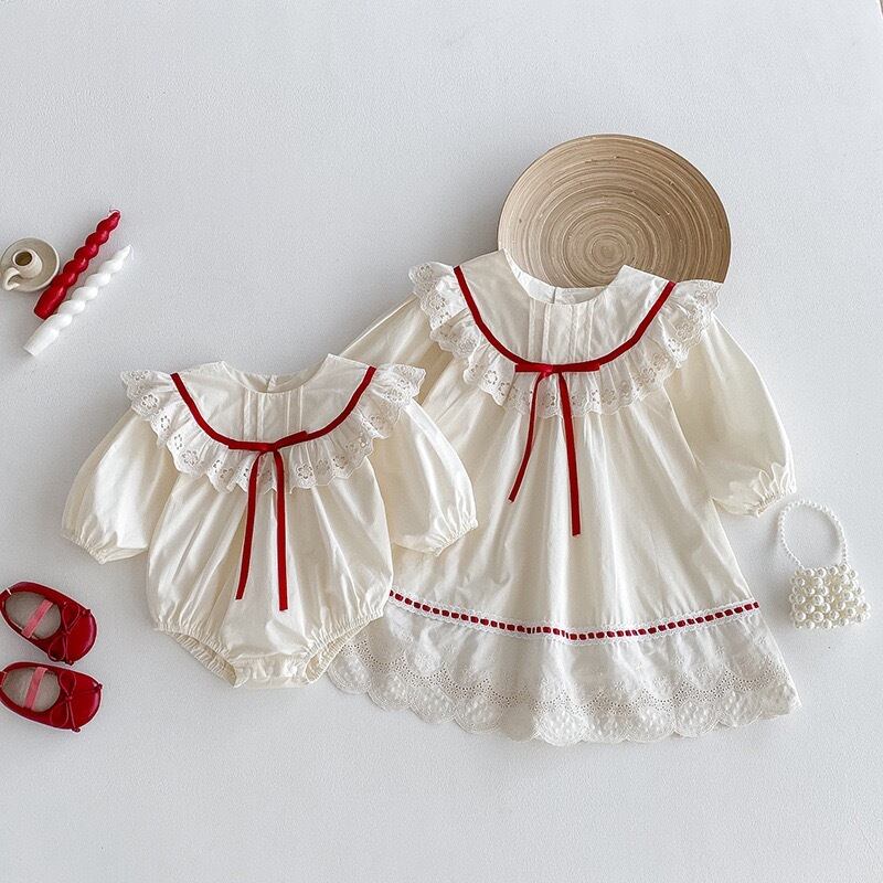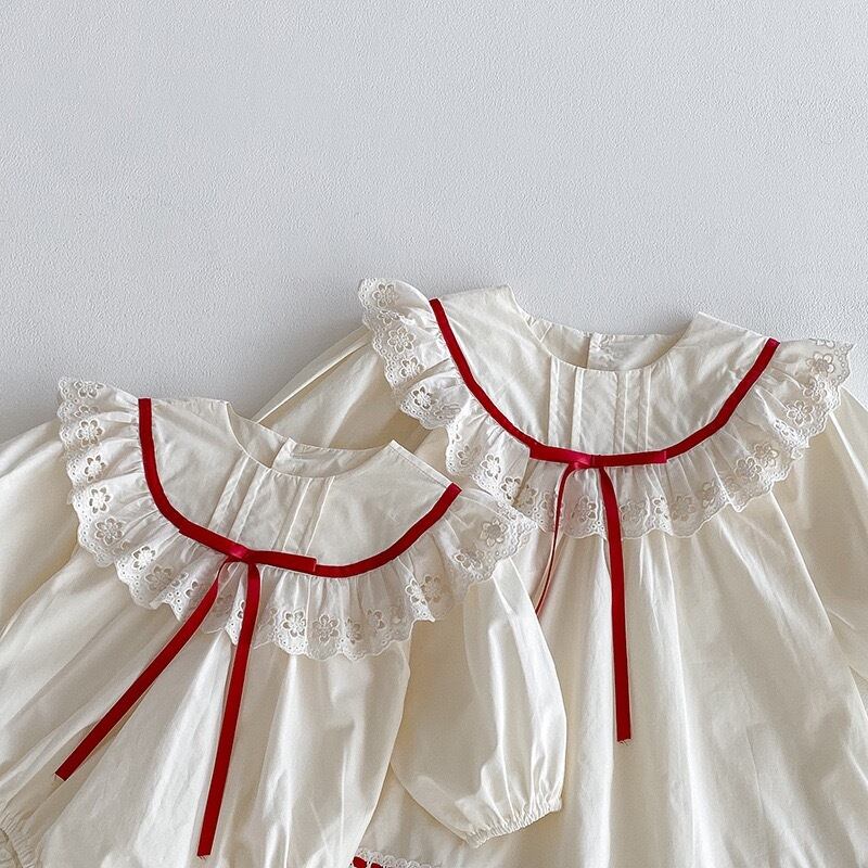 ,赤リボンが映える姉妹リンクコーデ