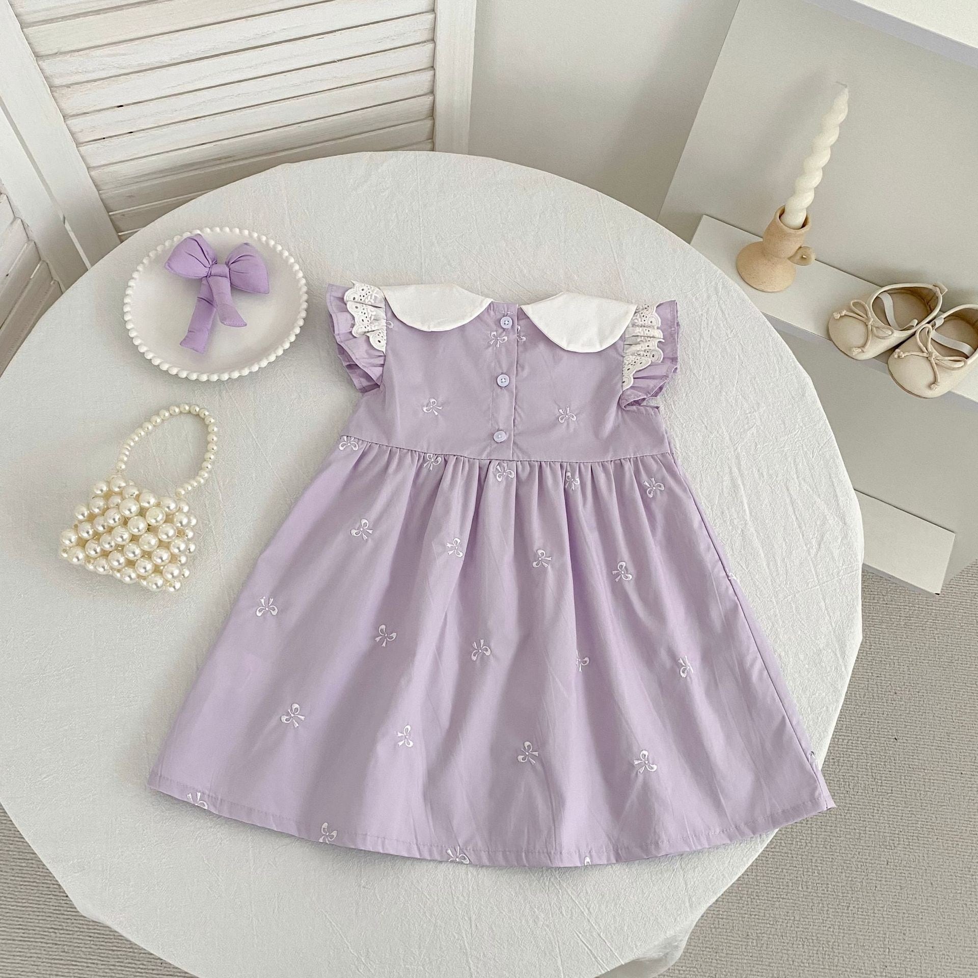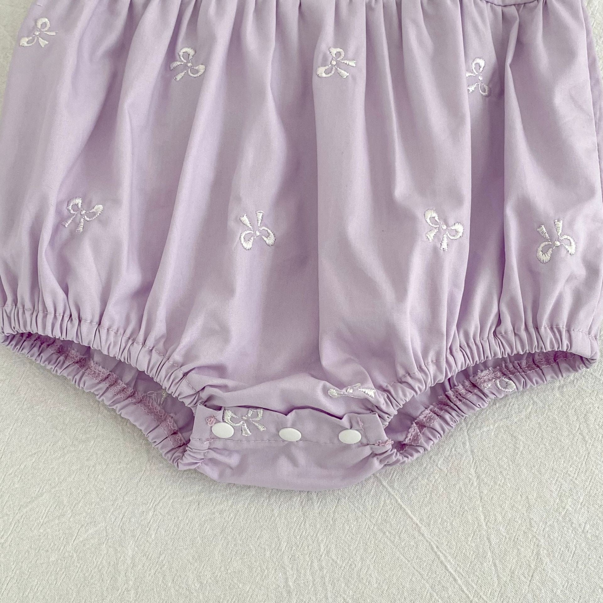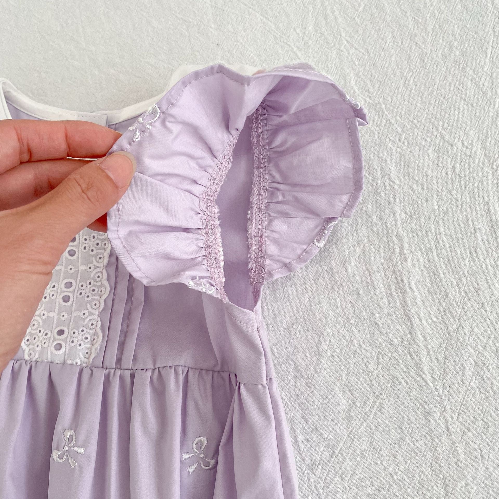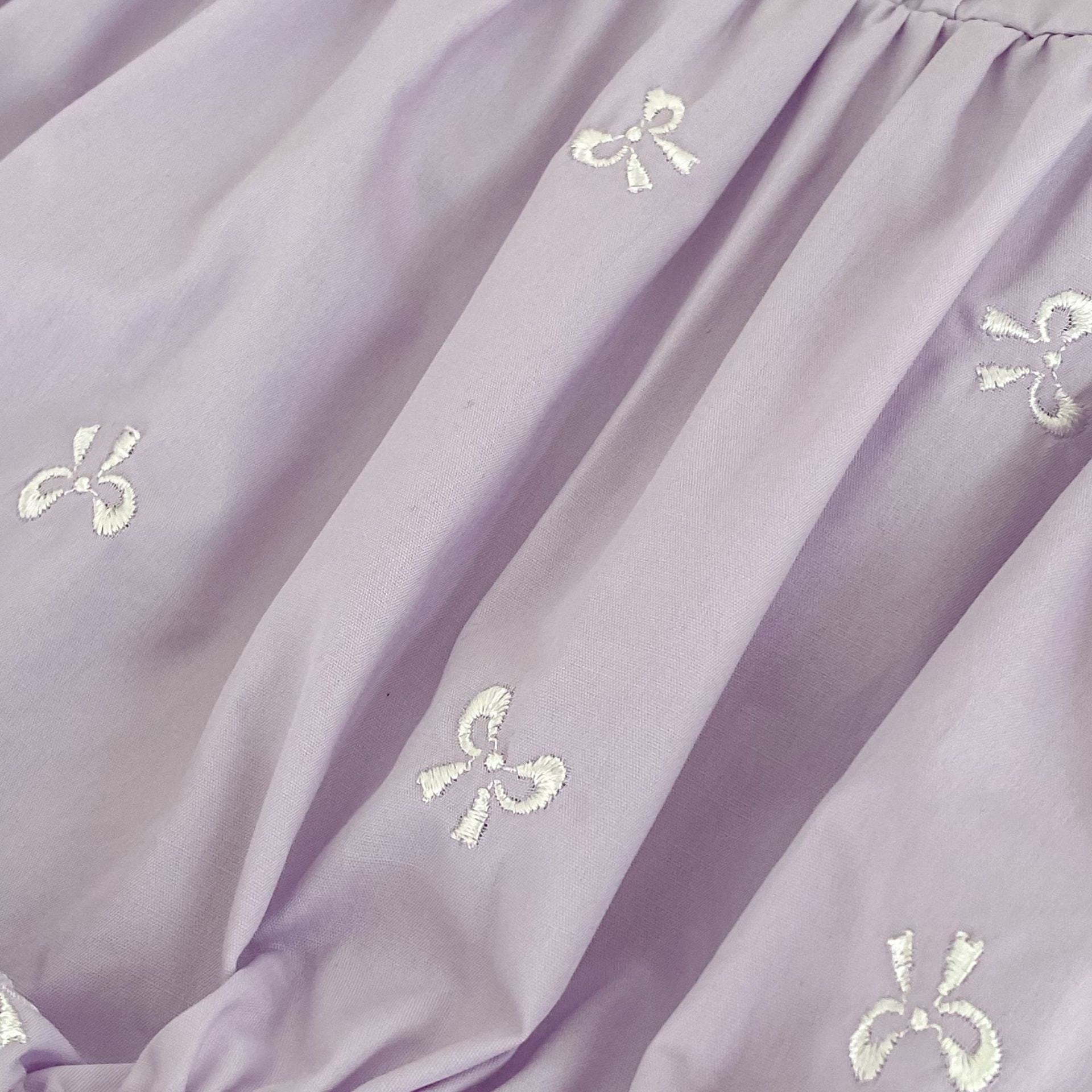 上品で華やかなパープルカラーをベースに、ドレス全体にはリボン刺繍が施され、さりげない可愛らしさを演出。