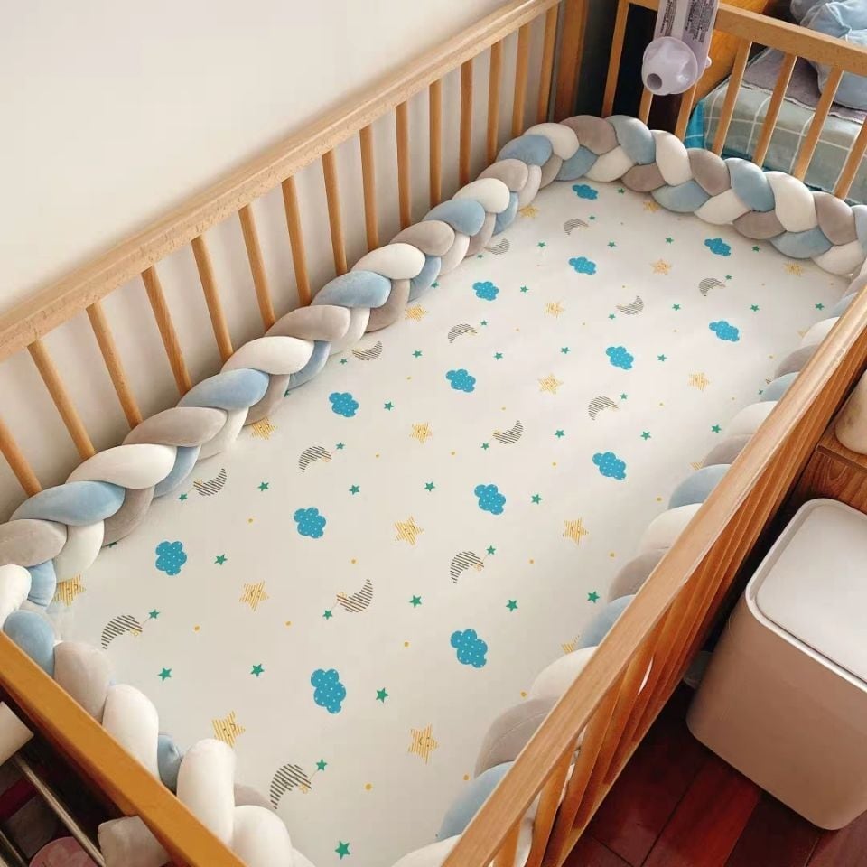 かわいい三編みのパステルカラーのベビーベッドガードです。