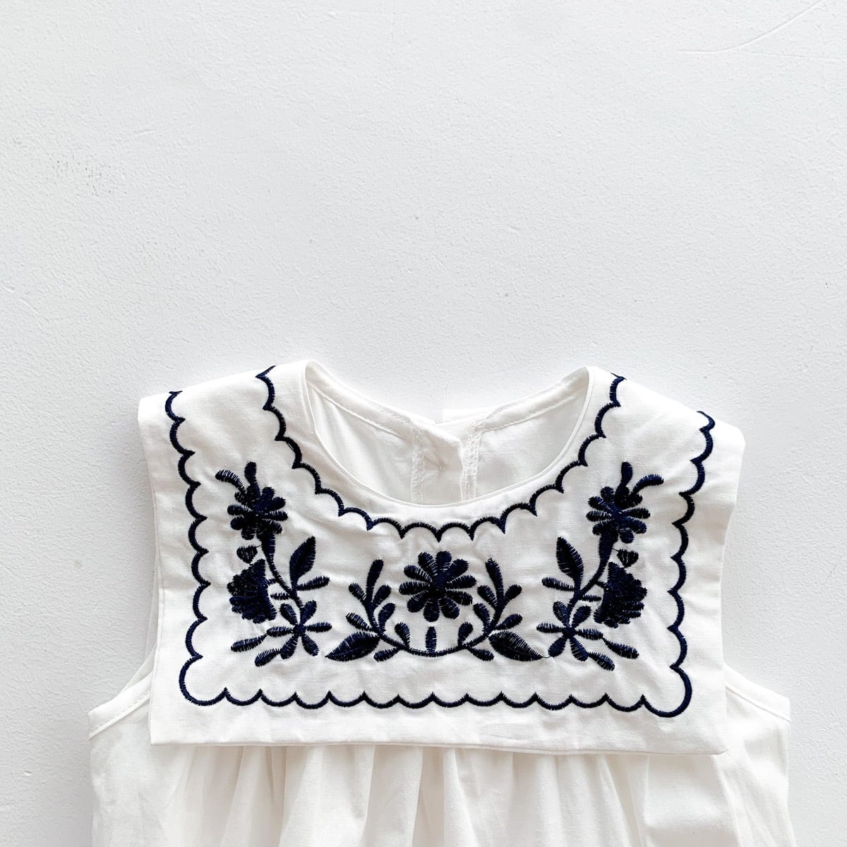 このロンパースは、ノースリーブで、大きなセーラー襟が特徴です。さらに、セーラー襟の前と後ろには花の刺繍が施され、上品なディテールがお子様を引き立てます。胸元にはギャザーが入っており、可愛らしいシルエットを演出します。