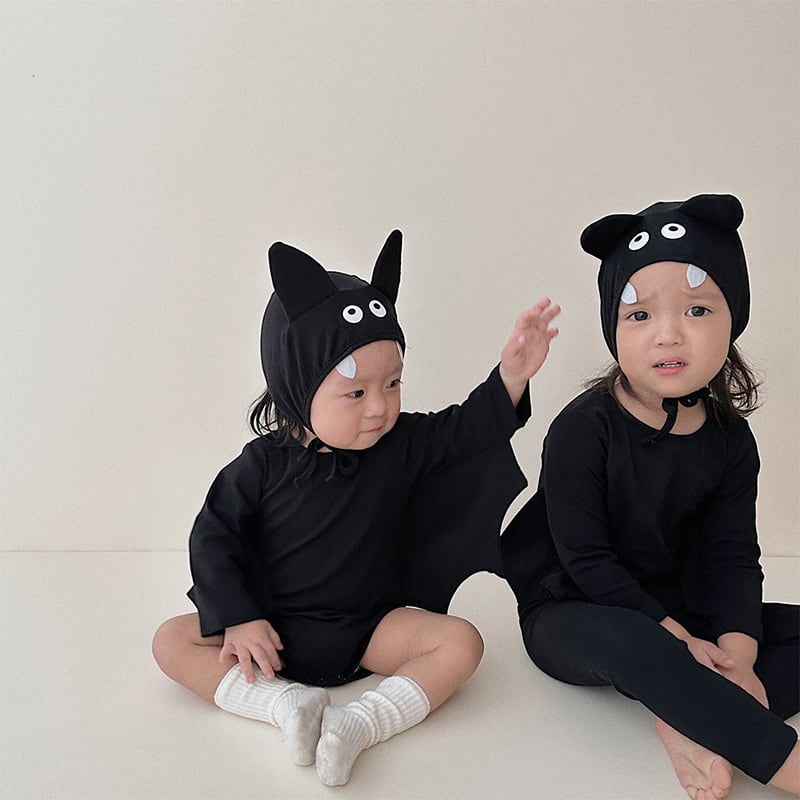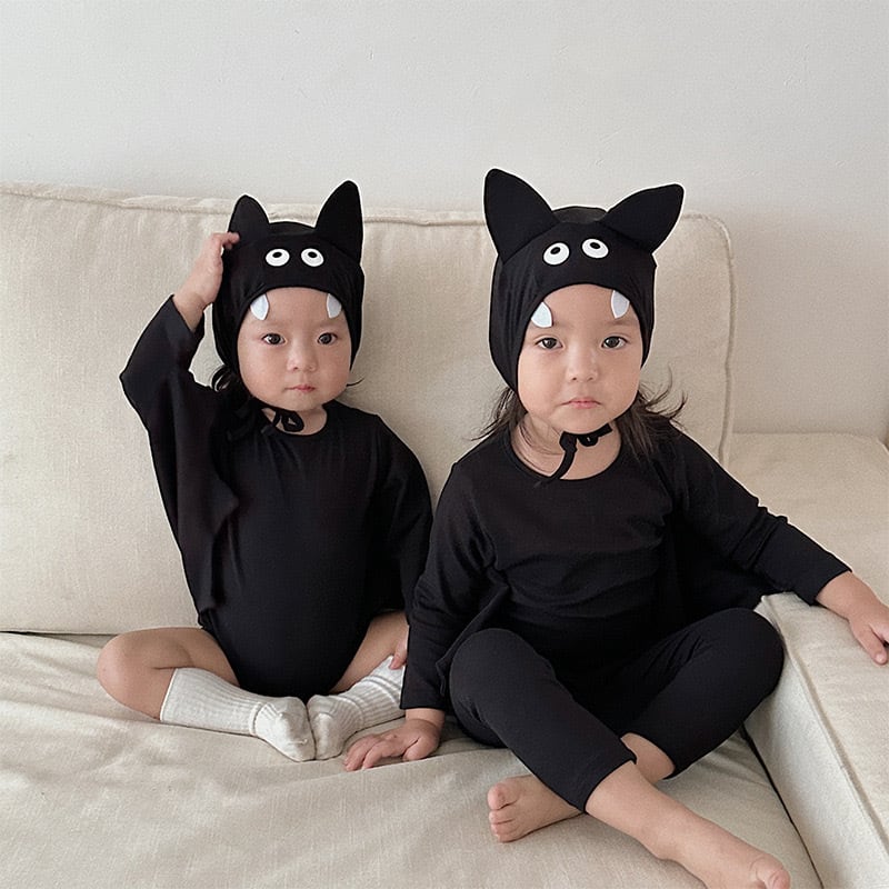 このセットには、長袖トップス、長ズボン、そしてなんといっても可愛さを引き立てるコウモリの顔付き帽子が含まれています。