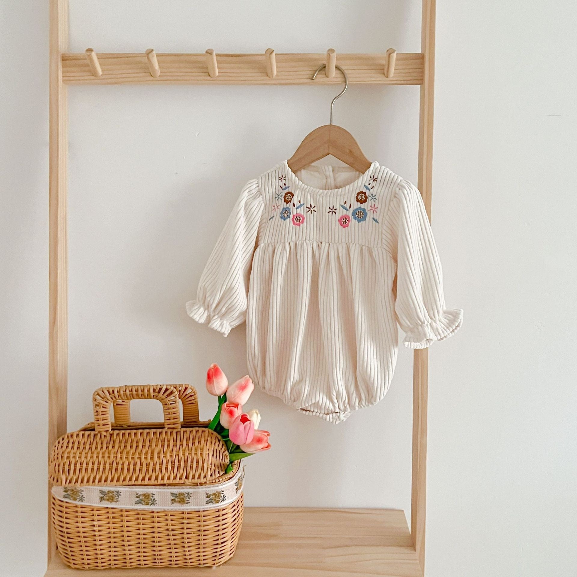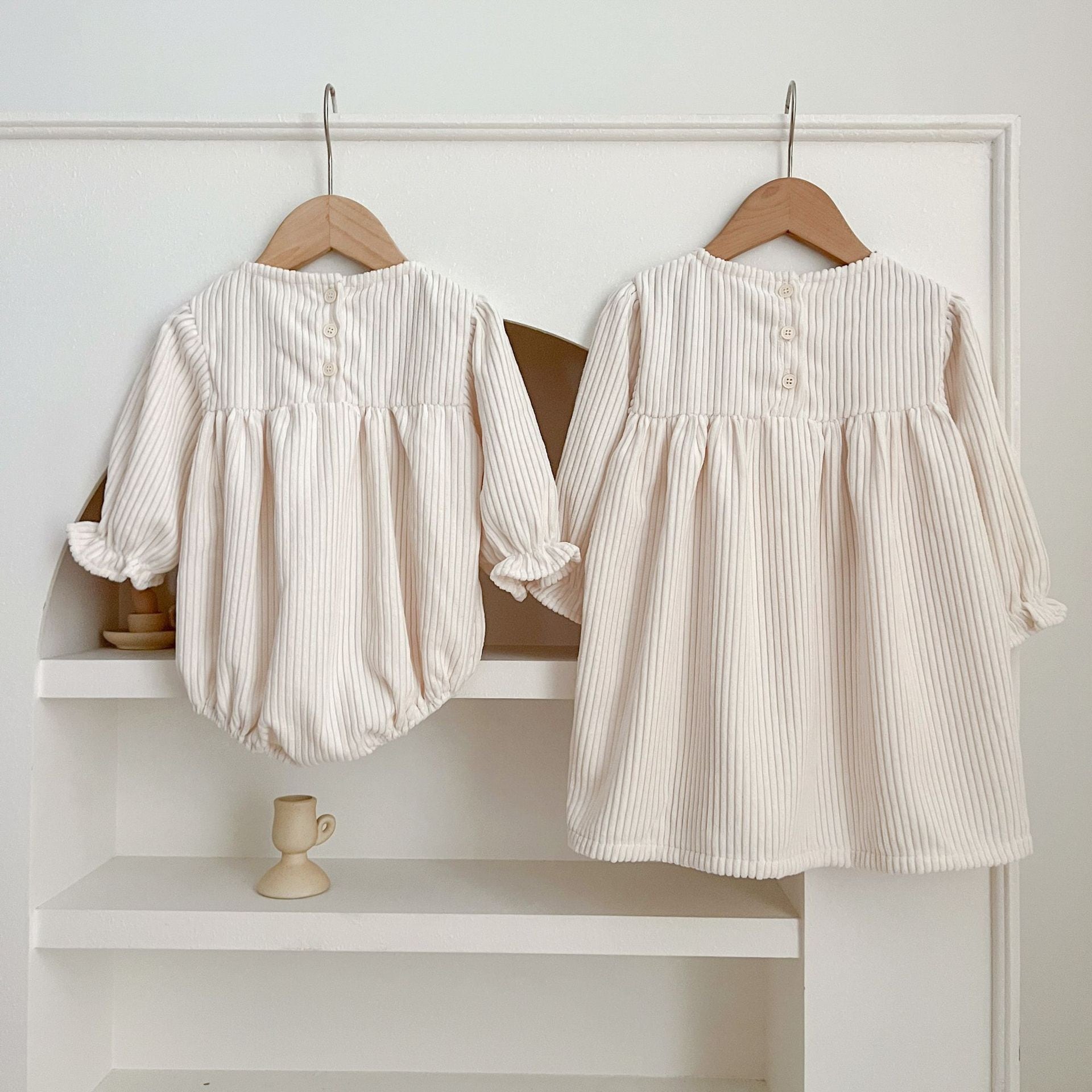 ,ベビー幼児女の子花刺繡コーデュロイロンパース ワンピース リンクコーデ アイボリー 秋冬ベビー服 お出かけ 誕生日フォト lwa0074