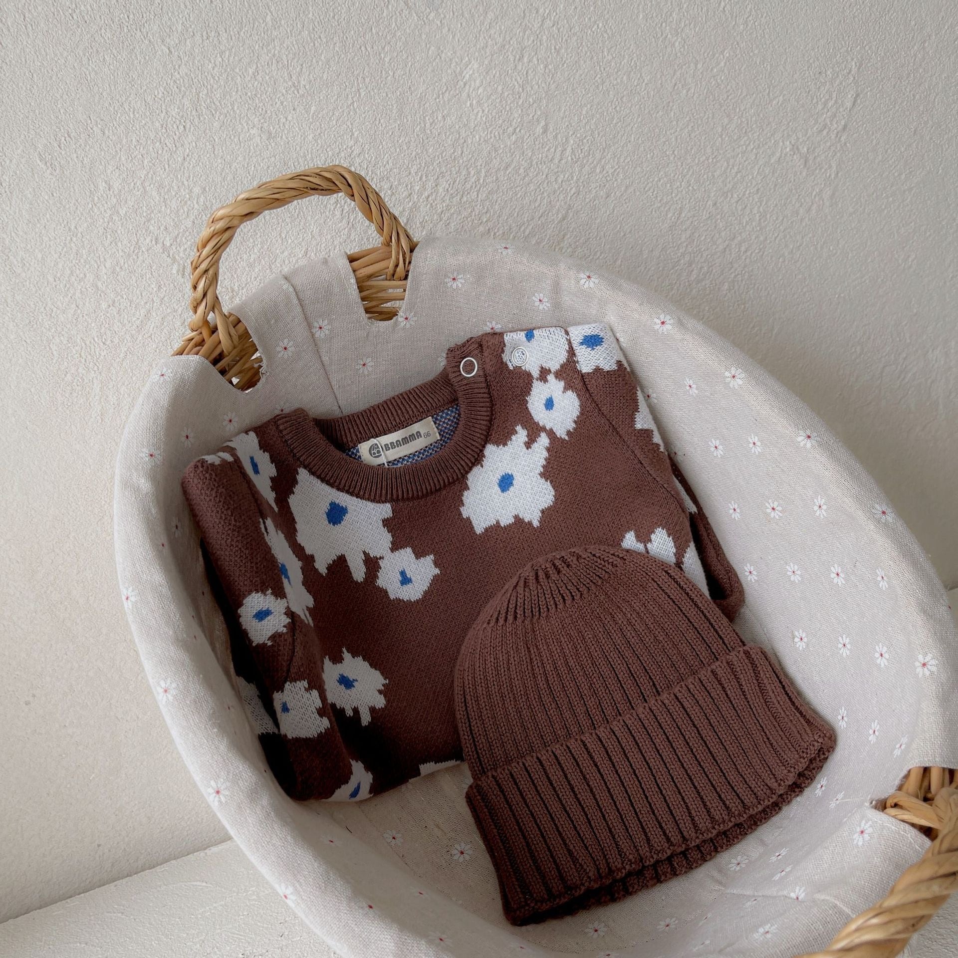 ブラウンのベースカラーに愛らしいホワイトの花柄が特徴のニットロンパースです。