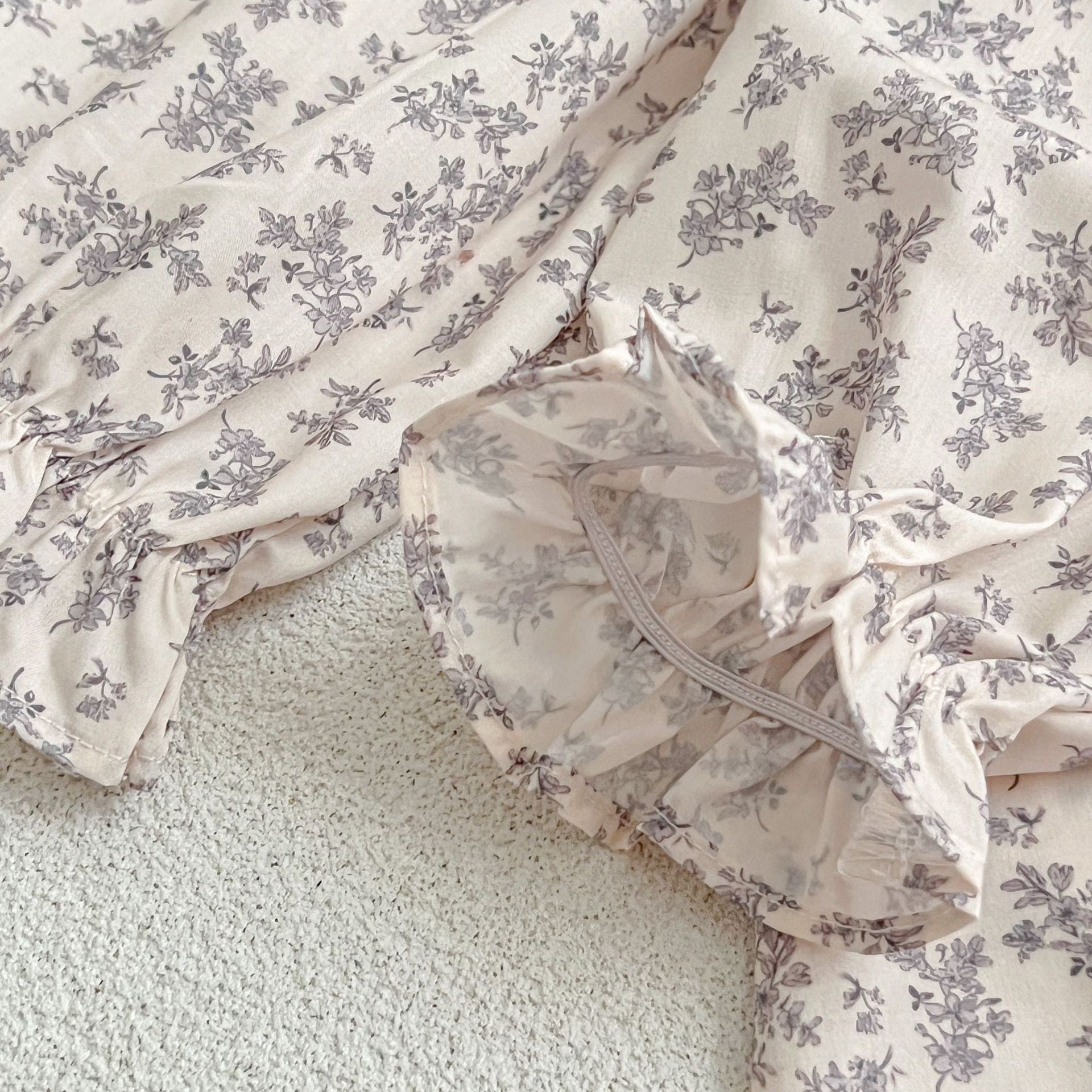 全体に広がる愛らしい紫色の小花柄が、清楚で華やかな雰囲気を演出します。