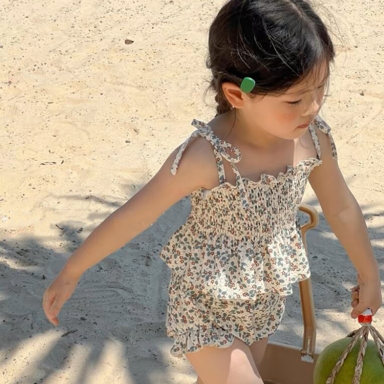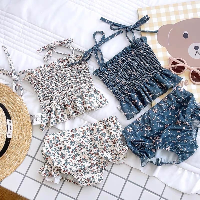 ,子供用女の子小花柄セパレート水着 キャミソール フリルボトムス キャップ付き 夏海プール水遊び lwk0134