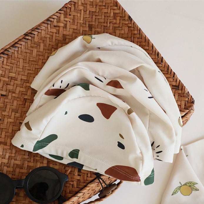 このセットには、長袖のラッシュガードとマッチングのボードショーツ、そしてキャップの3点が含まれています。北欧風の愛らしい柄が、レモン、ストーン、太陽、バナナの4つのバリエーションで展開されています。