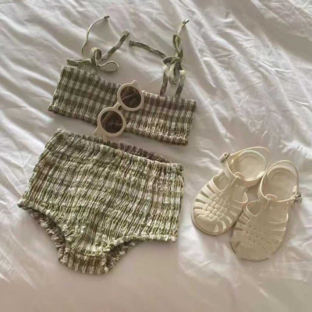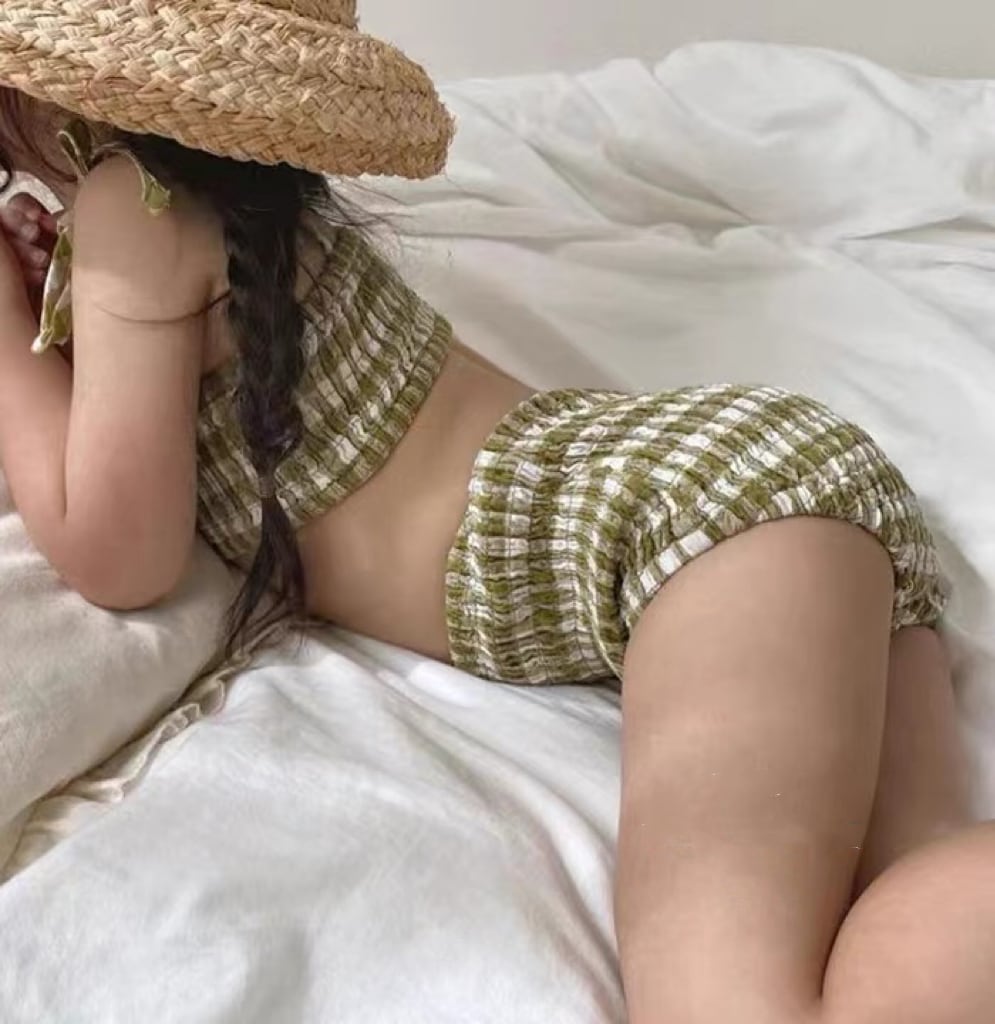 ,キッズ女の子セパレート水着 キャミソール グリーンチェック 夏海プール水遊び lwk0005