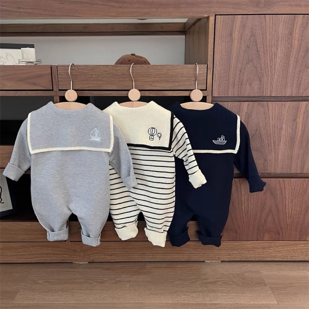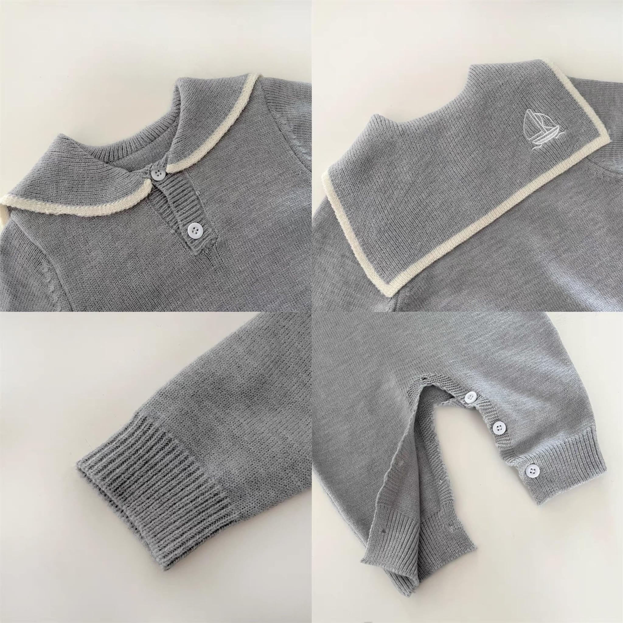 ,ベビー幼児男の子女の子セーラー襟ニットカバーオール 長袖ロンパース かわいい秋冬服 グレー ボーダー ネイビー lwb0016