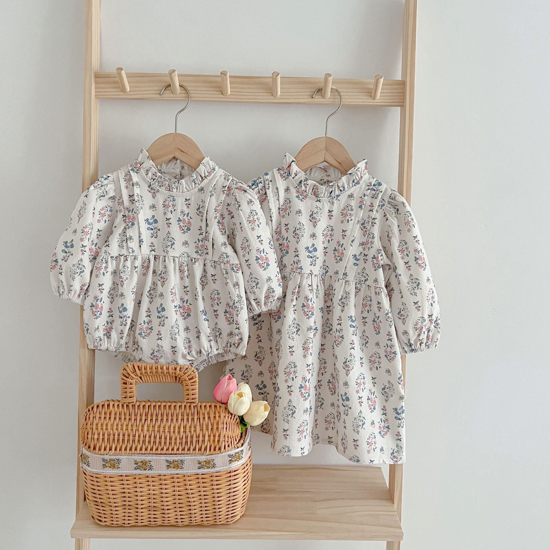 ,ベビーキッズ女の子小花柄長袖ロンパース ワンピース ベロアリンクコーデ 姉妹お揃い春秋冬服 韓国子供服 lwa0006