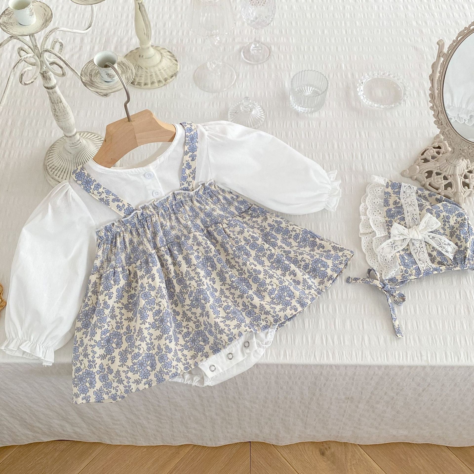 ,ベビー女の子100%綿パープル花柄フェイクレイヤードロンパース ボンネット付き お出かけ 記念撮影 lwb0136