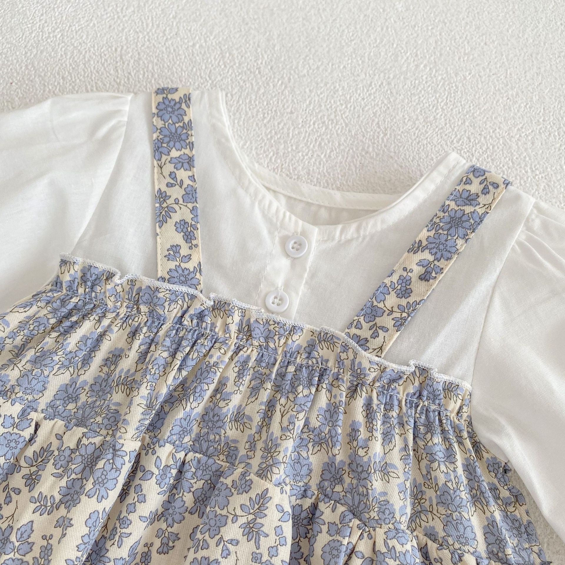 このロンパースは、ブラウスとサスペンダースカートを組み合わせたフェイクレイヤードデザインが特徴です。