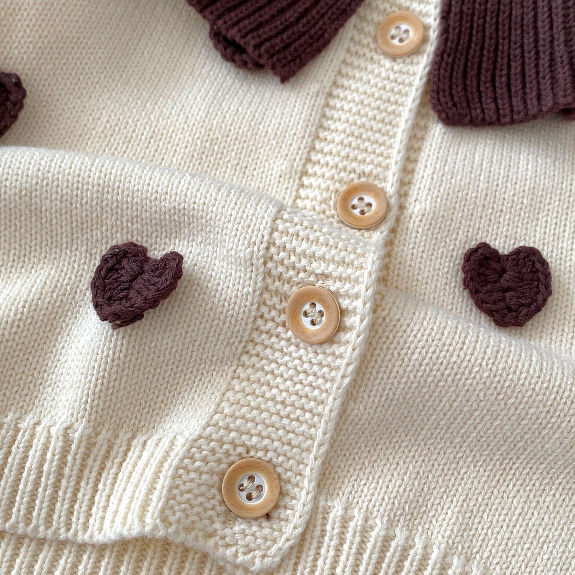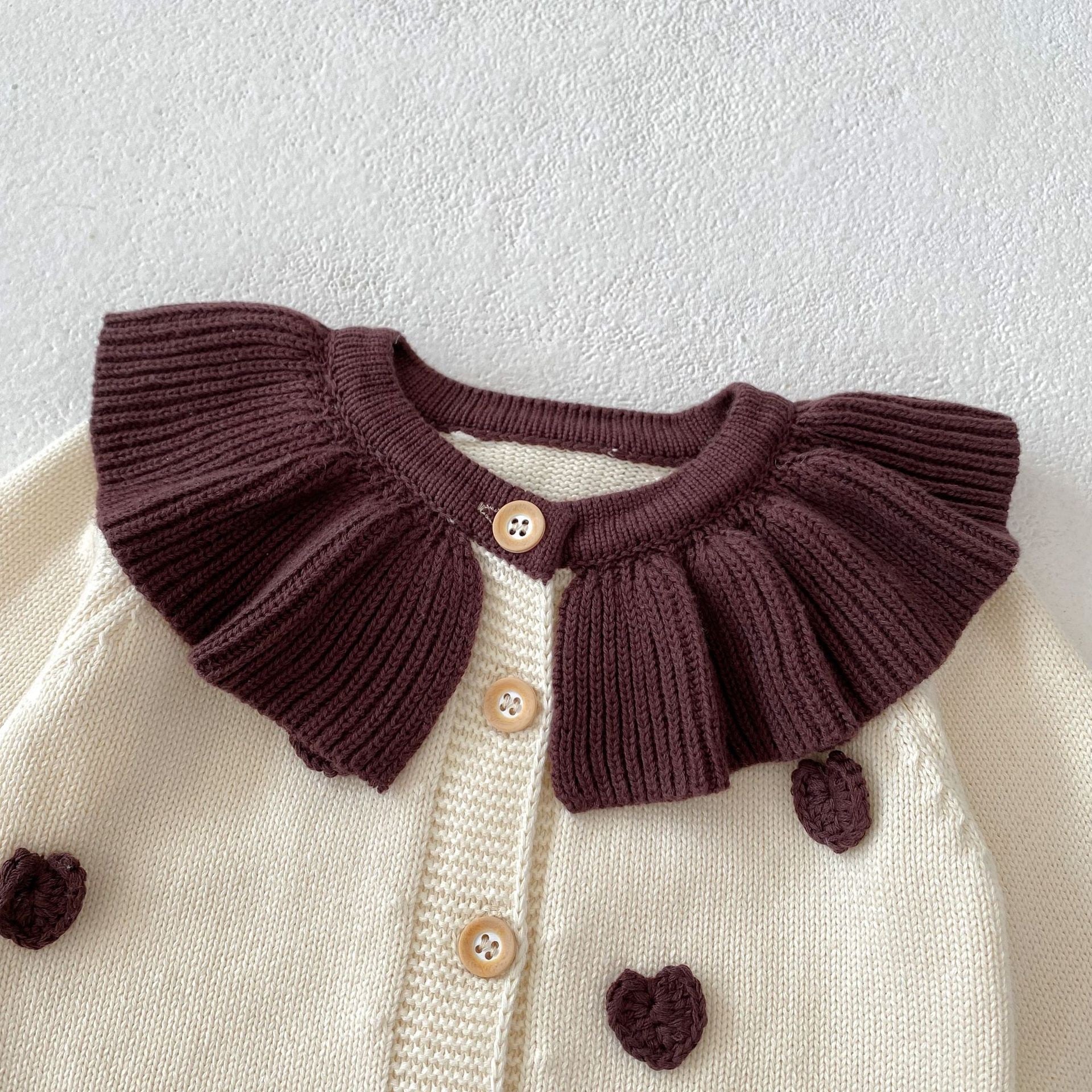 ,ベビー女の子100%綿ハートニットセットアップ カーディガン サロペットロンパース 出産お祝い 結婚式 お宮参り 記念撮影 ブラウン lwb0140