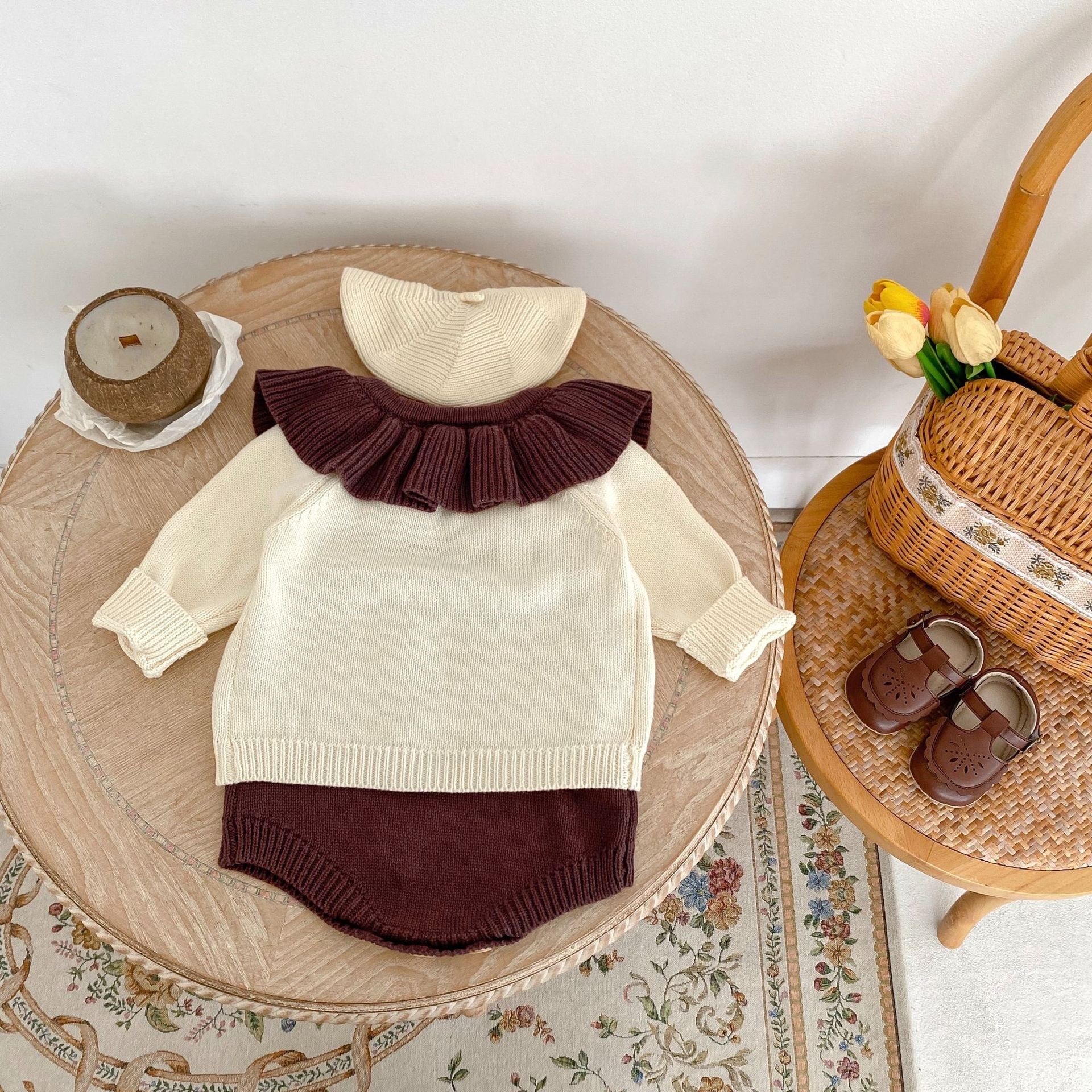 この魅力的な2点セットは、ニットカーディガンとサロペットロンパースで構成されており、特別な日のお祝いにもぴったりな一品です。