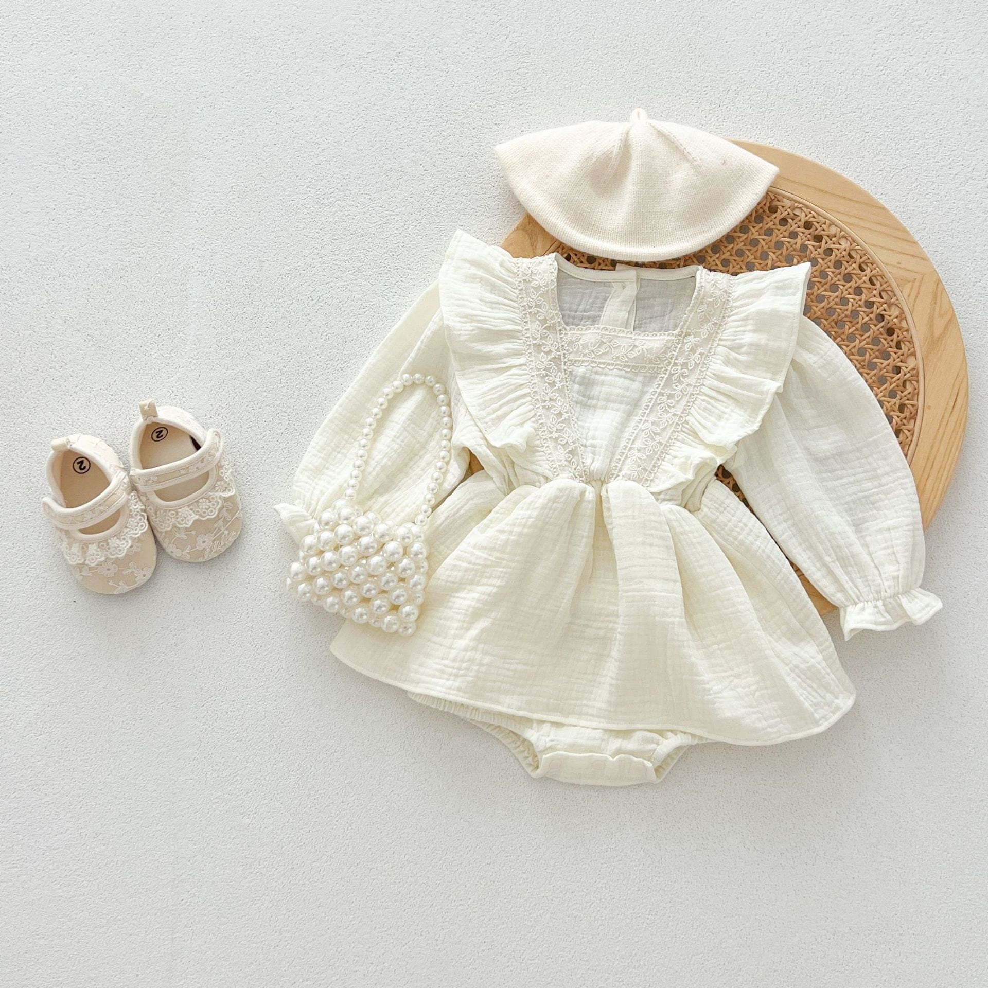 ,ベビー幼児女の子ガーゼワンピースロンパース レースフリル アイボリー ブラック かわいい春秋冬服 lwa0061